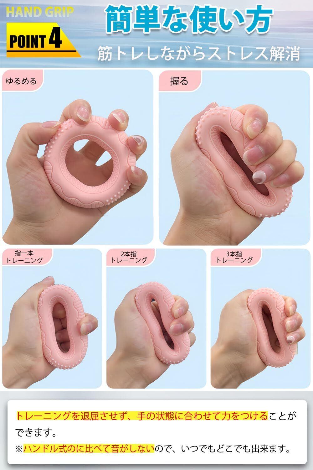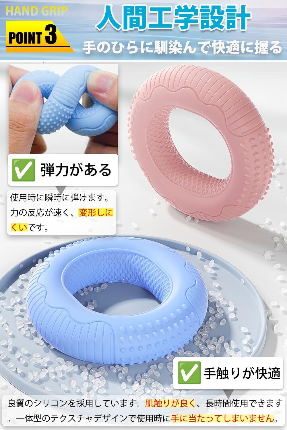 【人間工学】本製品は良質のシリコンを採用しています。弾力があり、使用時に瞬時に弾けます。力の反応が速く、変形しにくいです。肌触りが良く、長時間使用できます。シリコン素材なので、簡単に洗濯できます。いやな臭いはしません。ハンドル式のに比べて音がしないので、いつでもどこでも出来ます。