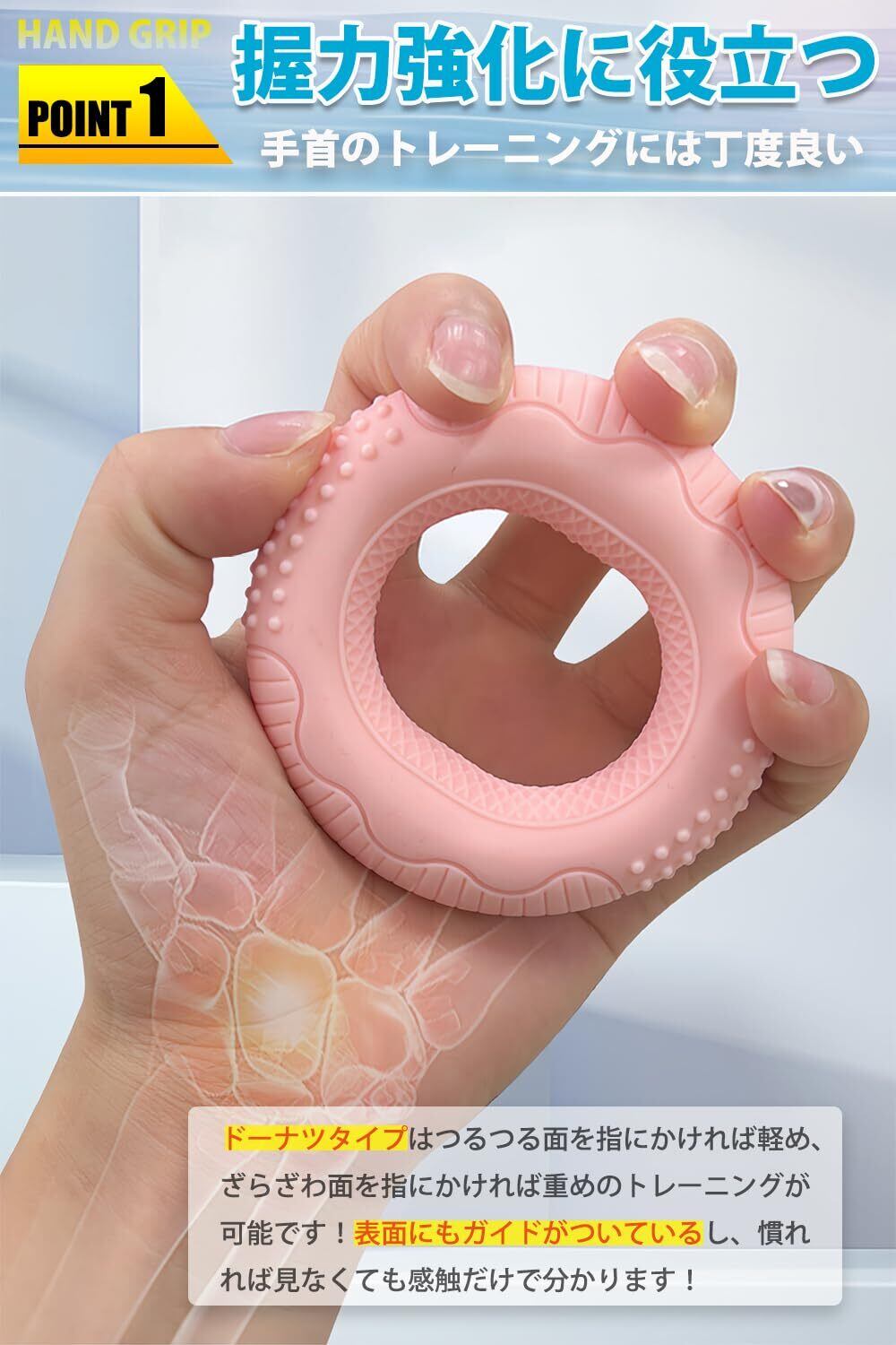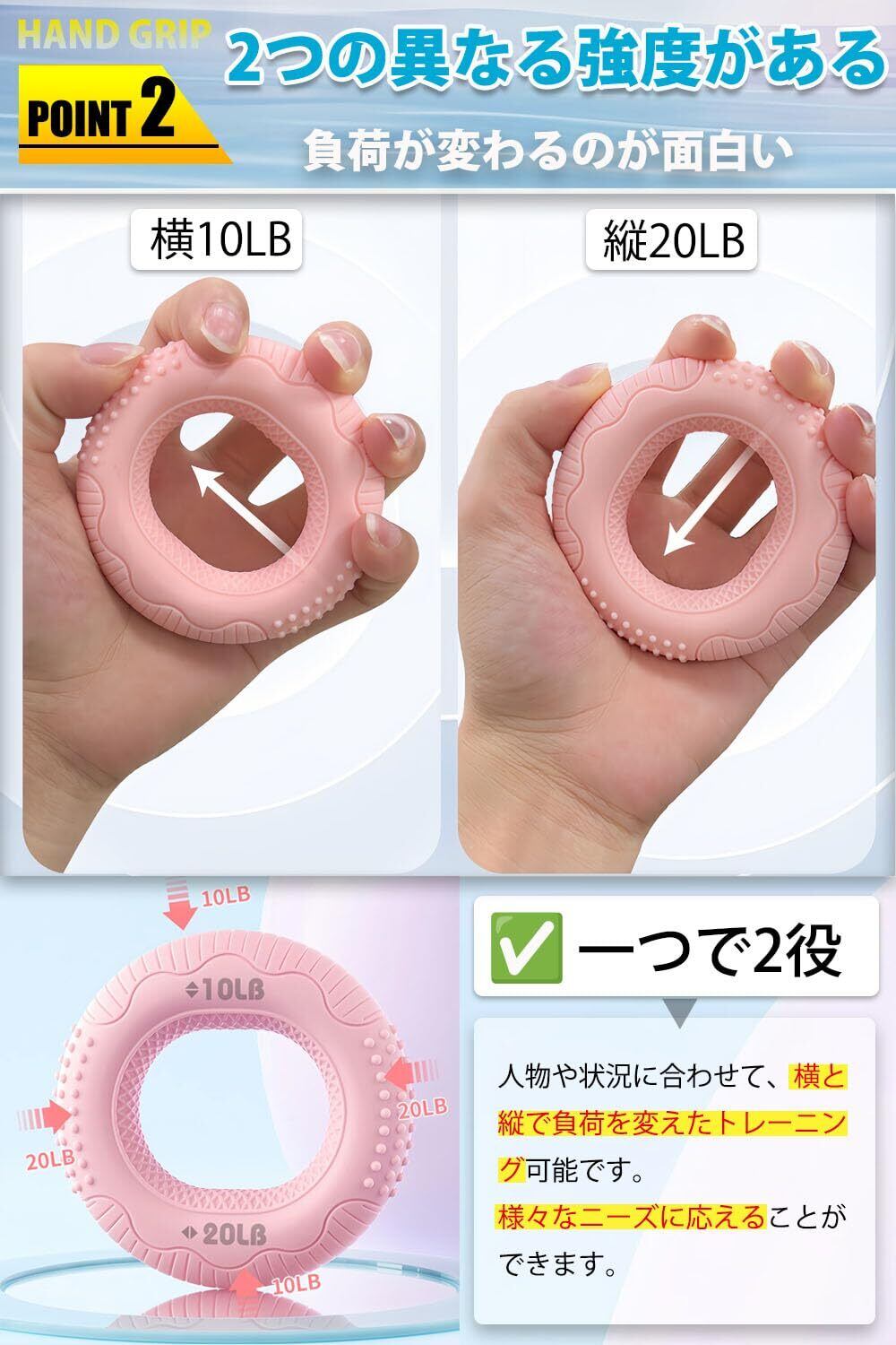 【一つで2役】2つの異なる強度があり,それぞれの強度に対応できます。人物や状況に合わせて、横と縦で負荷を変えたトレーニング可能です。丸みを帯びたデザインを採用しており、手のひらに馴染んで快適に握れます。一体型のテクスチャデザインで使用時に手に当たってしまいません。