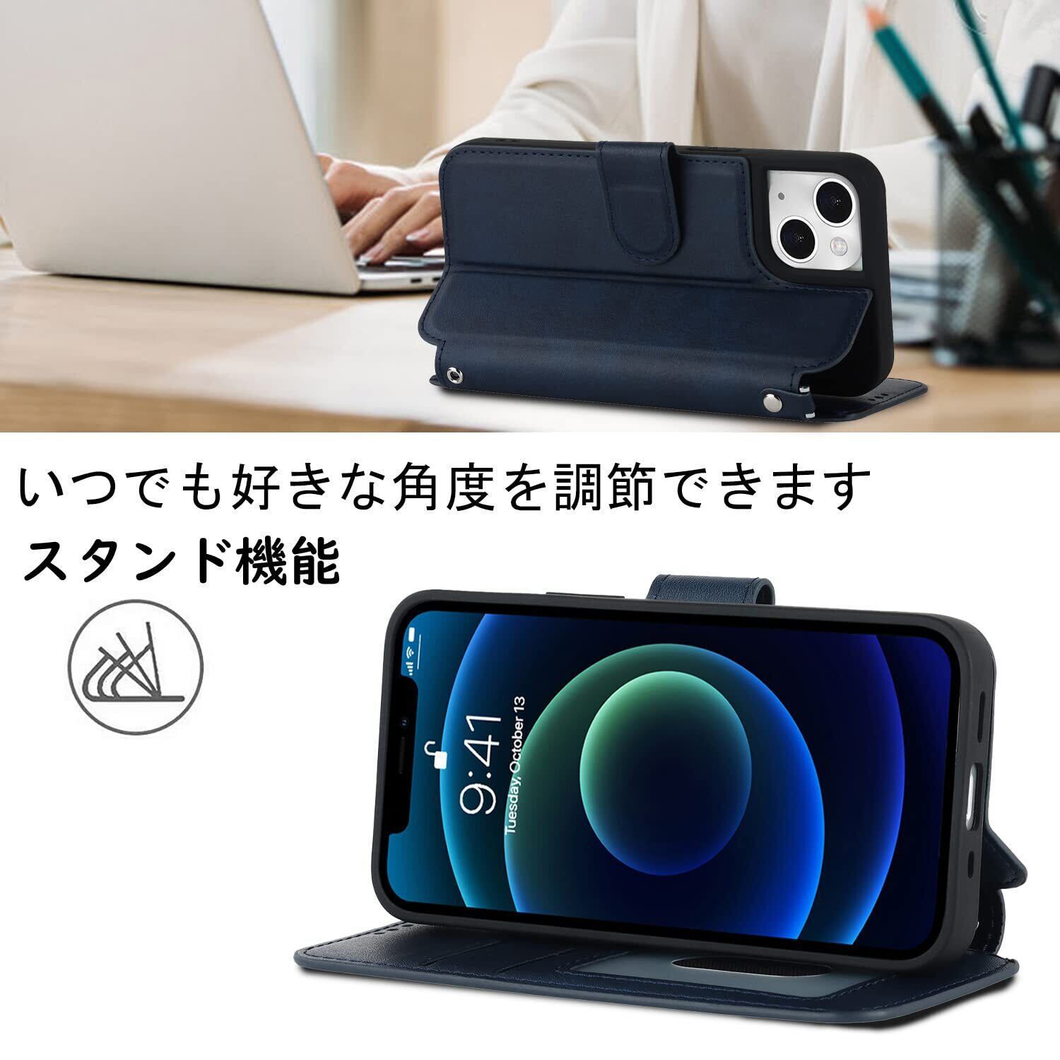 【横置きスタンド機能】マグネットが内蔵されているので、ベルトがなくてもフタがぴったり閉まります。横置きスタンド機能が付きまして、好きな角度を調節です。カバーにスピーカーホールを設置し、閉じた状態での通話を可能にしました。