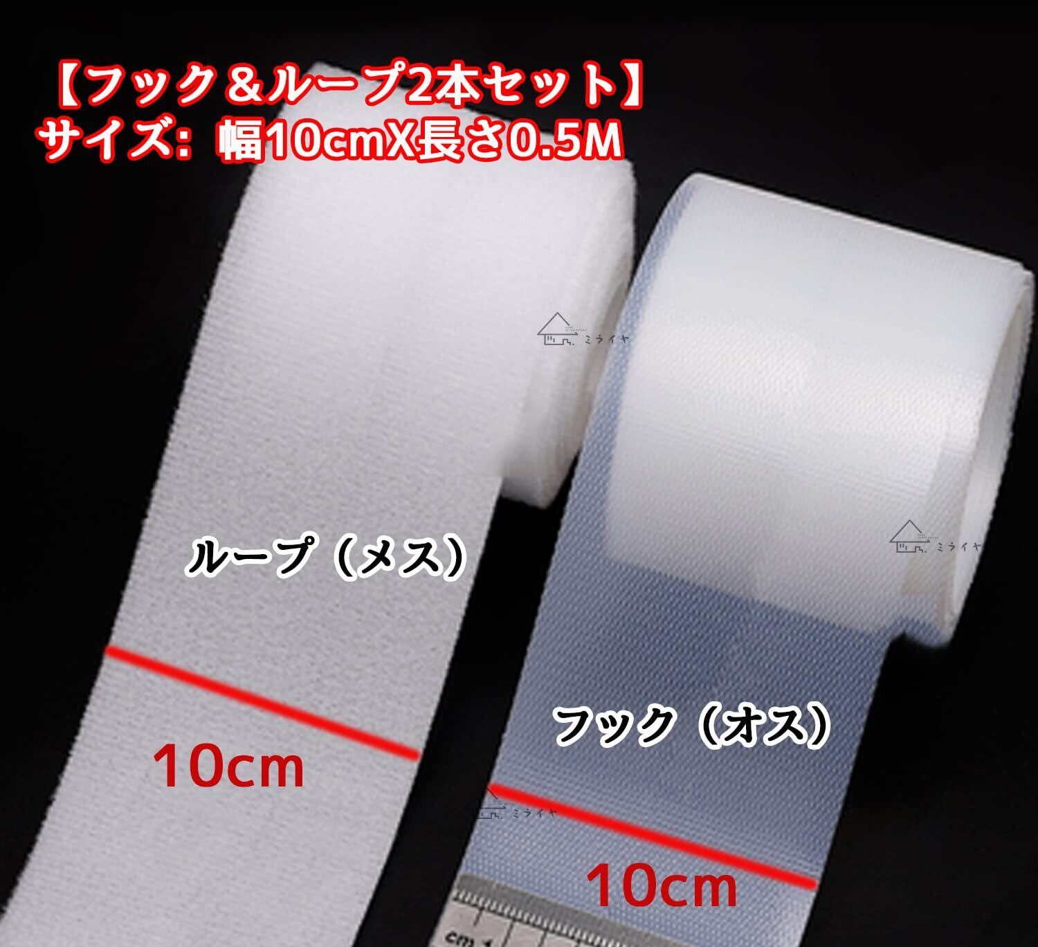 ミライヤ 極薄 柔らかい ドール 面ファスナー ベルクロ フック&ループのセット マジックテープ 超強力 多用途 手芸 縫製用 裁縫用 裏粘着剤なし 手縫い・ミシン用 ナチュラルホワイト オスメスセット(幅10cmX長さ50cm)