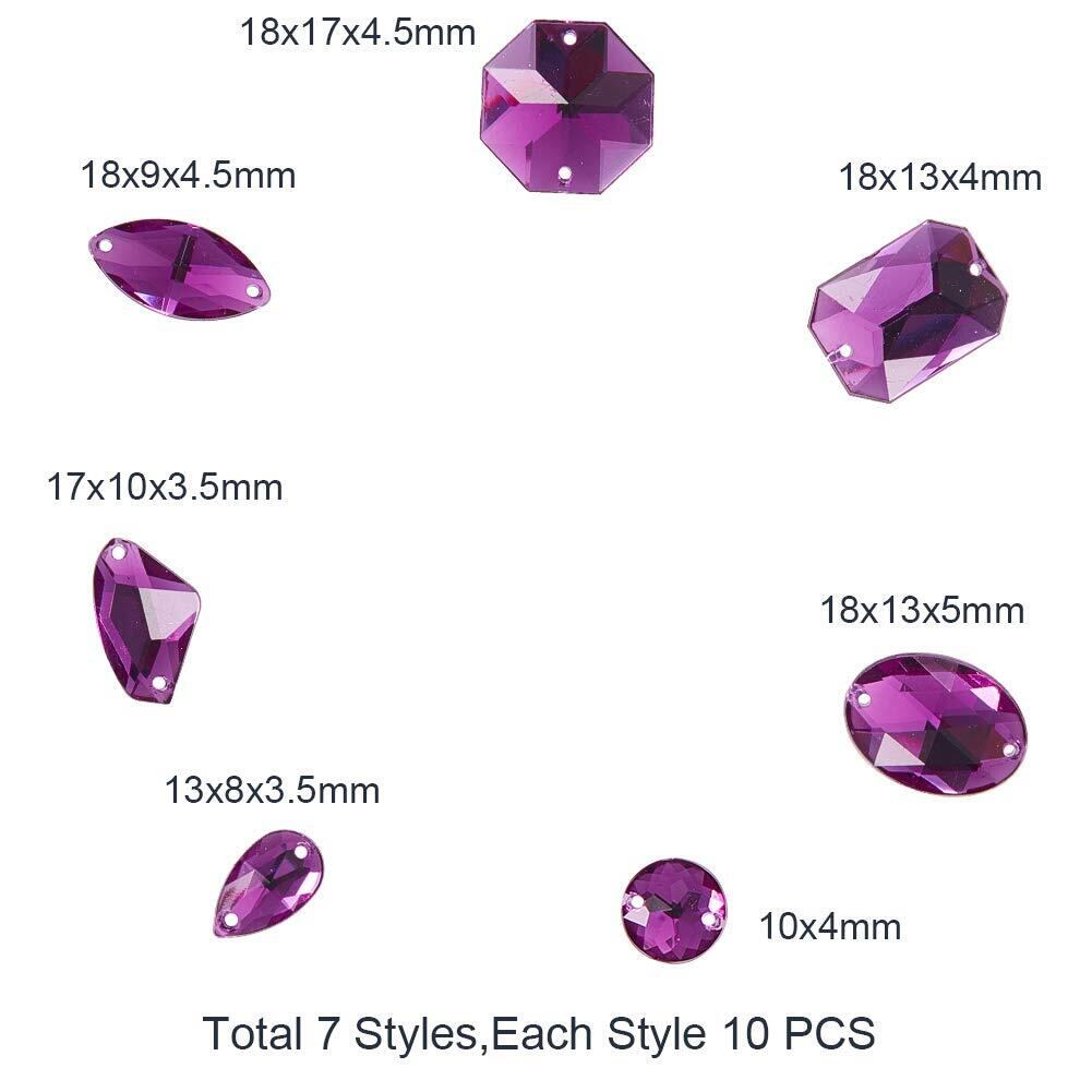 PH PandaHall 約70個/セット 7種 ビジュー パーツ 2穴 アクリル ラインストーン 縫製フラットバック カボション レジン封入 デコ素材 手芸用 クラフト ジェリー用 アクセサリーパーツ 手作り素材 装飾材料 パープル