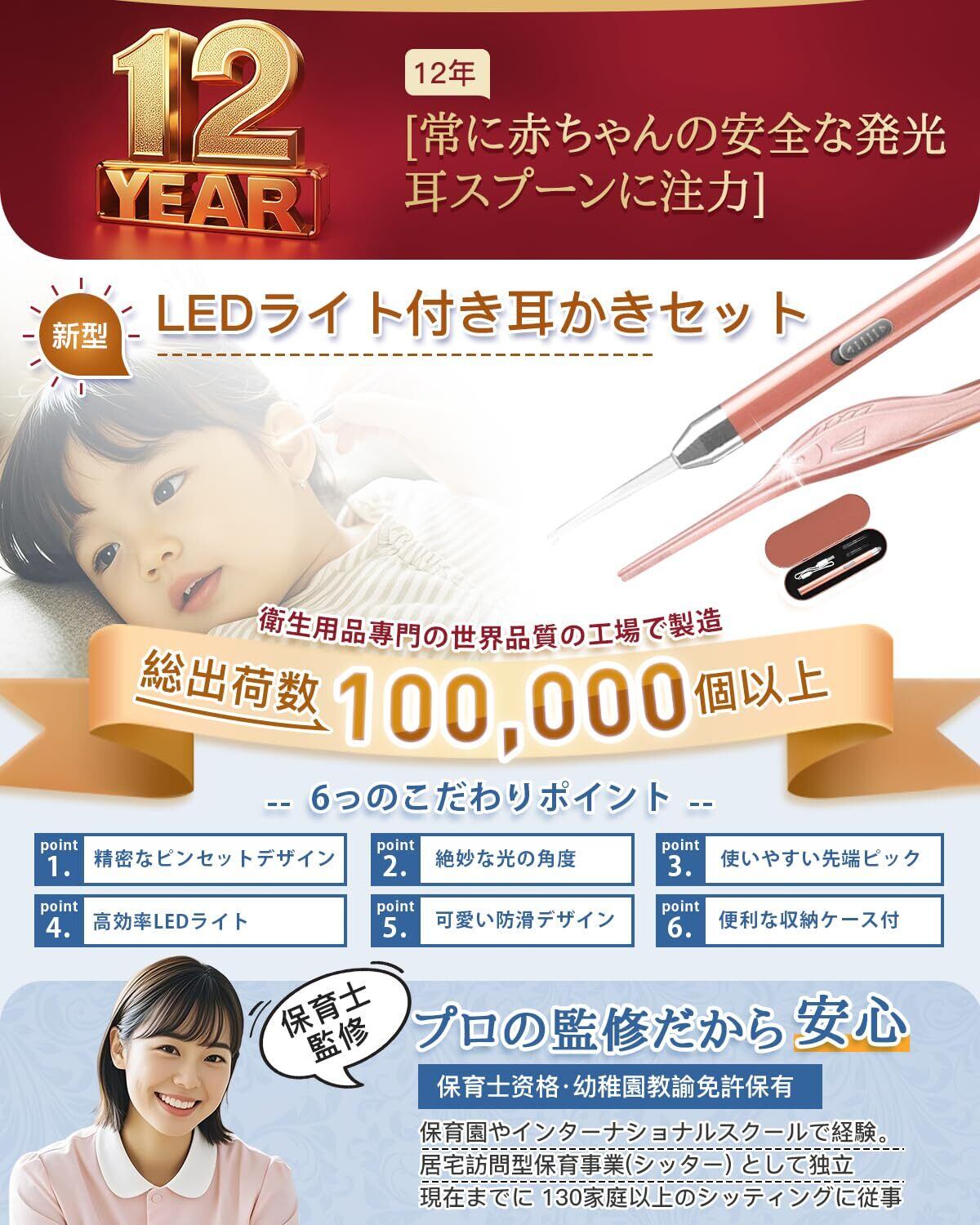 【耳かき】: LEDライトで耳内部を確認しながら掃除可能。大人用と子供用でサイズが異なるため、大小1つずつの耳かきパーツを同梱。
