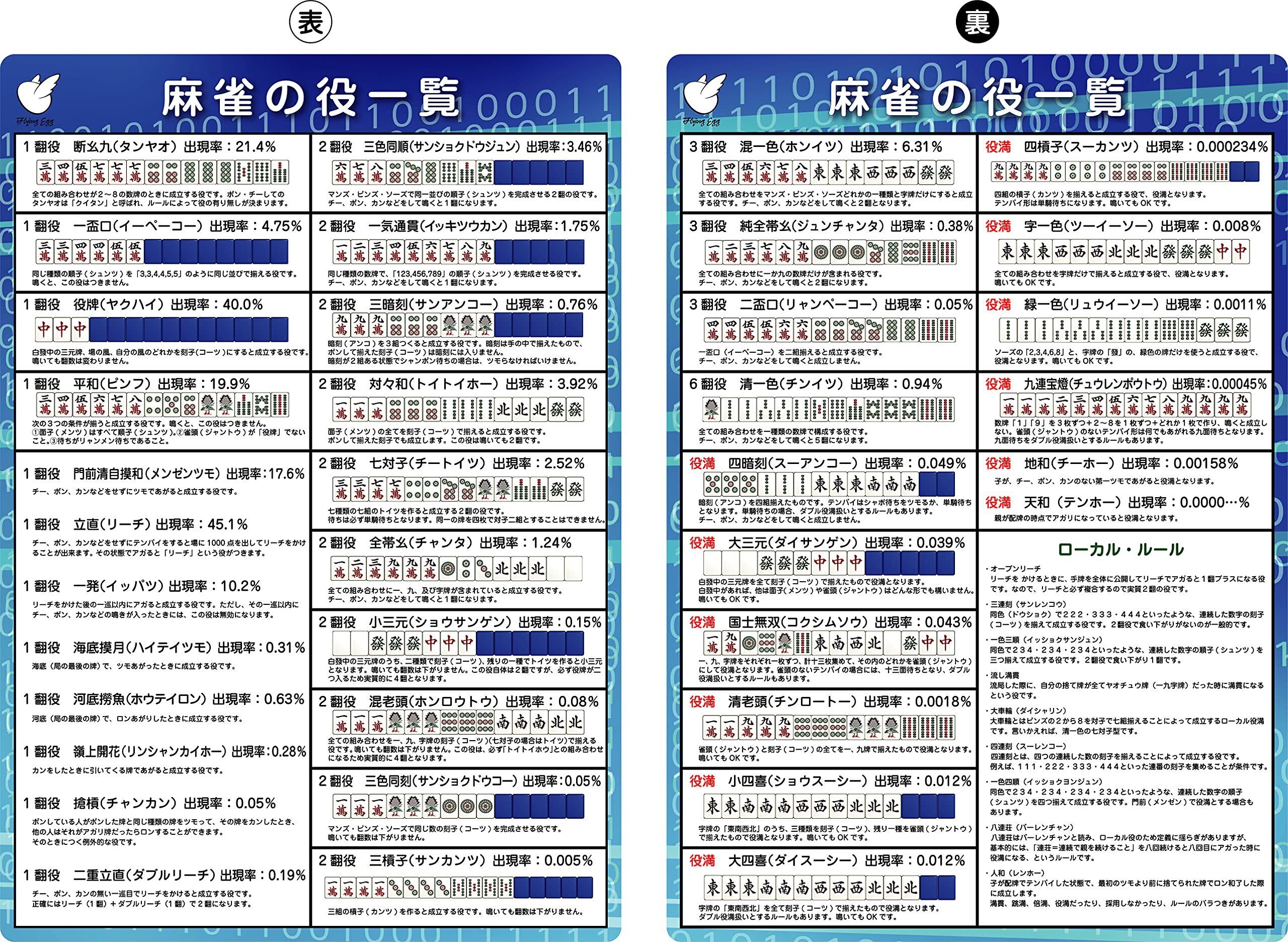 表には1〜2翻、裏には3翻〜役満〜ローカルルールを掲載してあります。