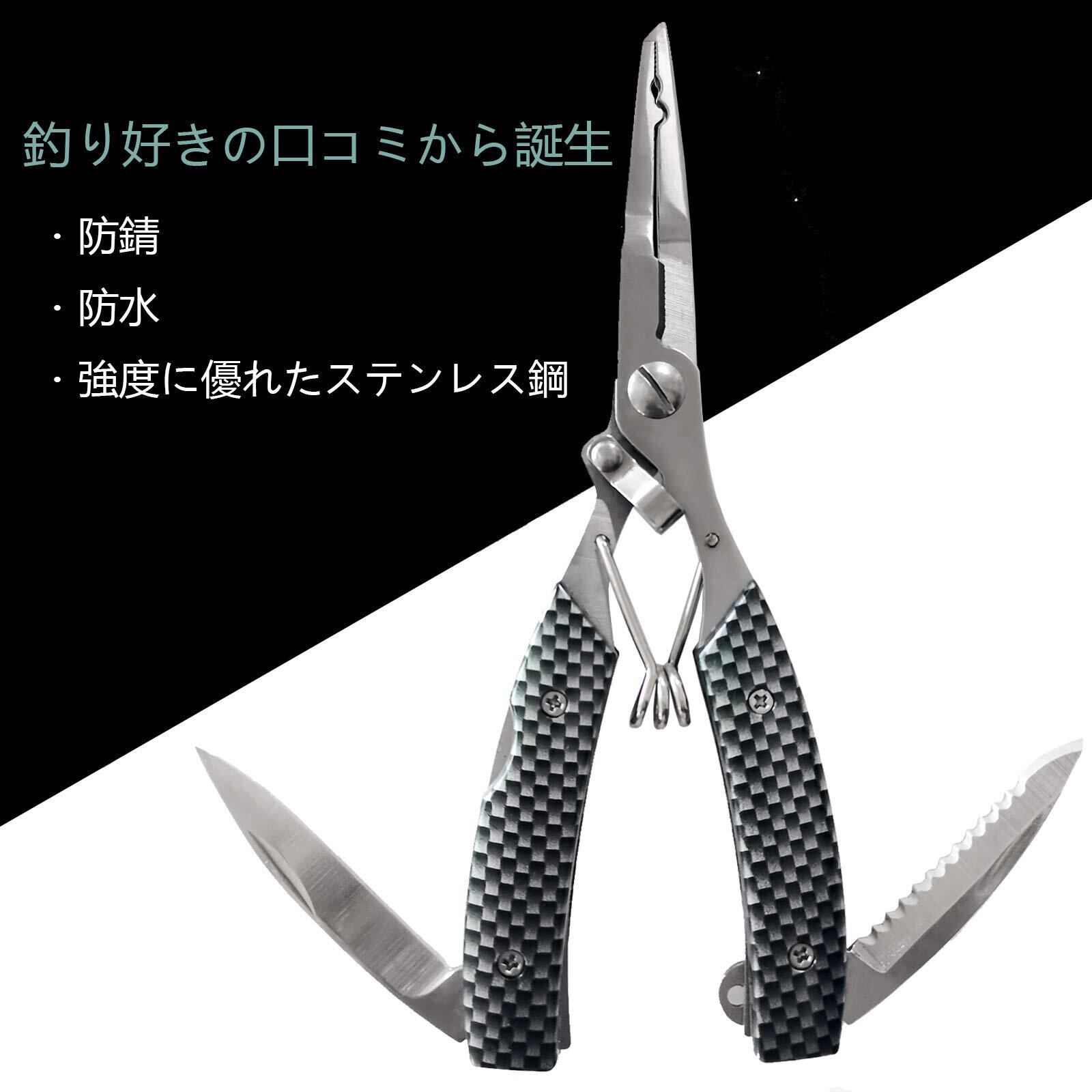 【長いロングノーズ+安全に針外し】本製品は先端が細いロングノーズタイプですので魚の口に簡単に入れる事が可能で簡単に針を掴んで外す事が出来ます。左右非対称の形状で設計されていて、スプリットリング外し、オモリ潰し、ラインカットなど多機能を備えています。タングステンカッターを使用し、PEラインも楽々カットできます。