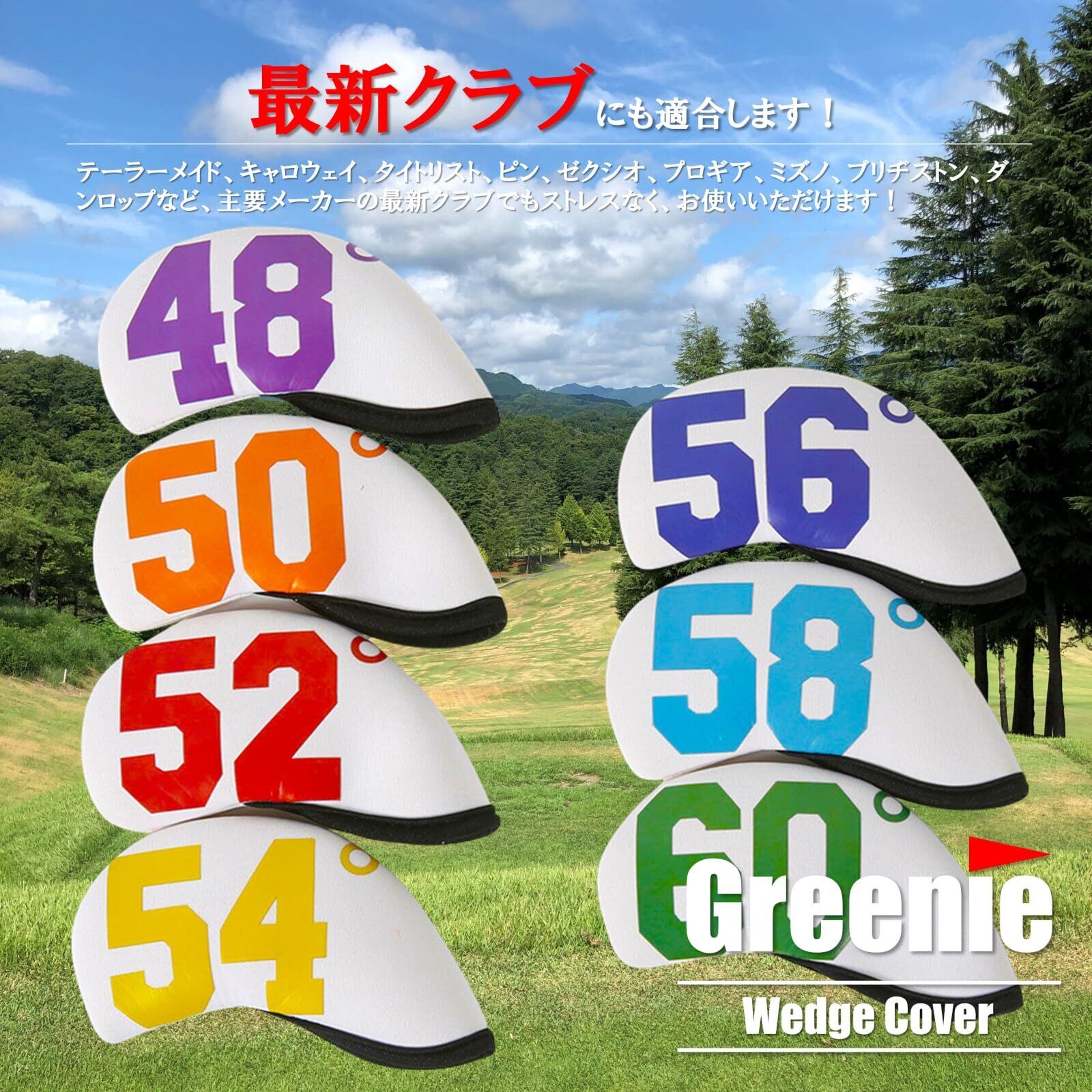 【単品販売】Greenieウエッジカバーは、単品でお買い求めいただけます。番手表示は、48・50・52・54・56・58・60度の7種類、カラバリは2種類!お使いのクラブに合わせ、お選びいただけます!