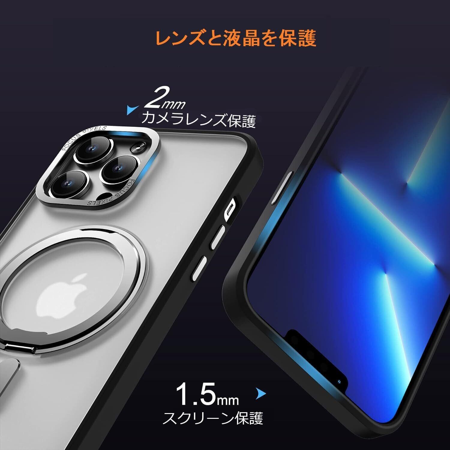 【360 Degree 回転MagSafeリング・スタンド一体】iPhone 13/14 用 ケース MagSafe対応 あいほん13/14用スマホケース 隠しスタンド機能 角度調整可 縦横両対応 ストラップホール付き 【ストラップ1種付き】米軍規格取得 耐衝撃 カメラレンズ保護 半透明 マット感ケース ワイヤレス充電対応 人気 6.1インチ(アイホン13/14ブラック)