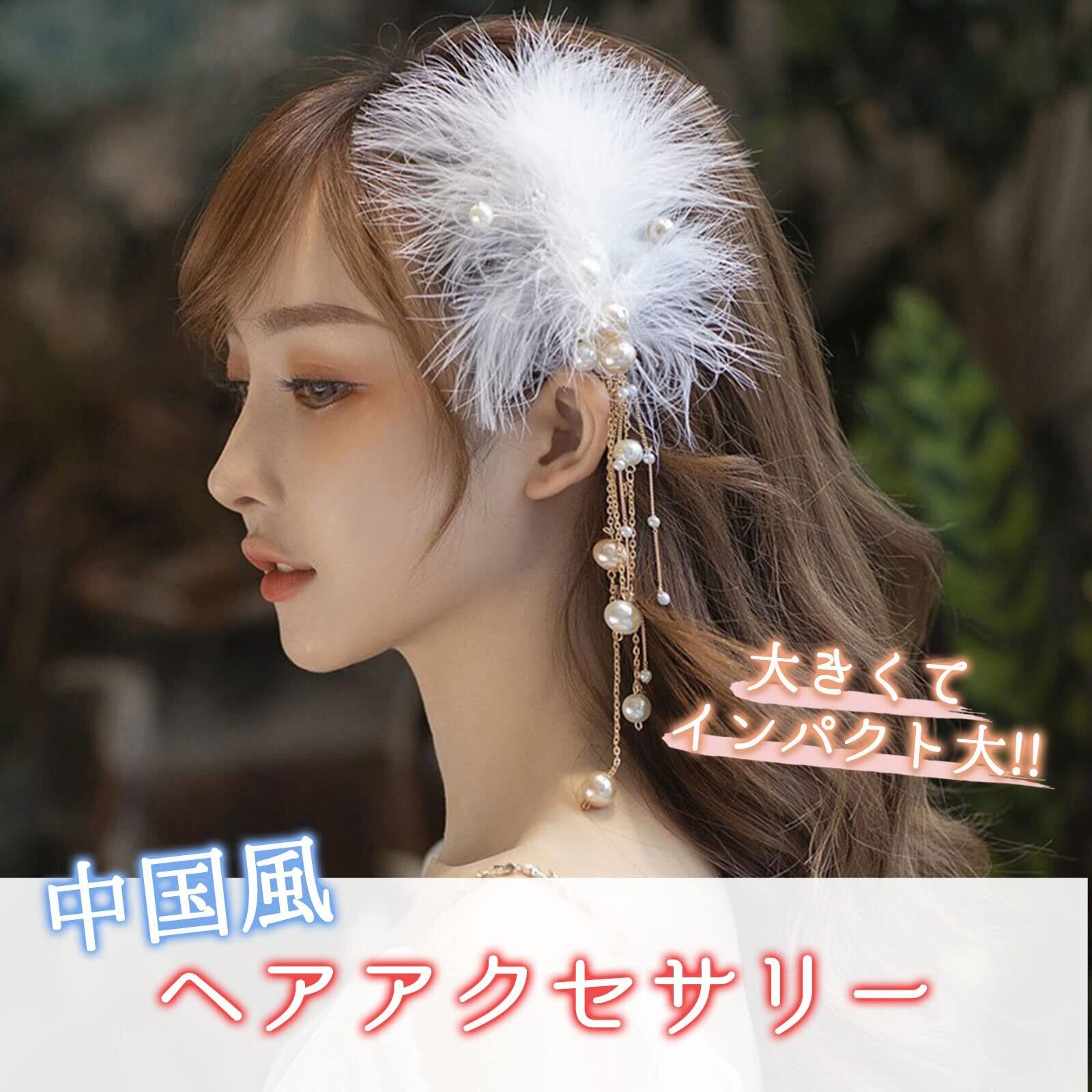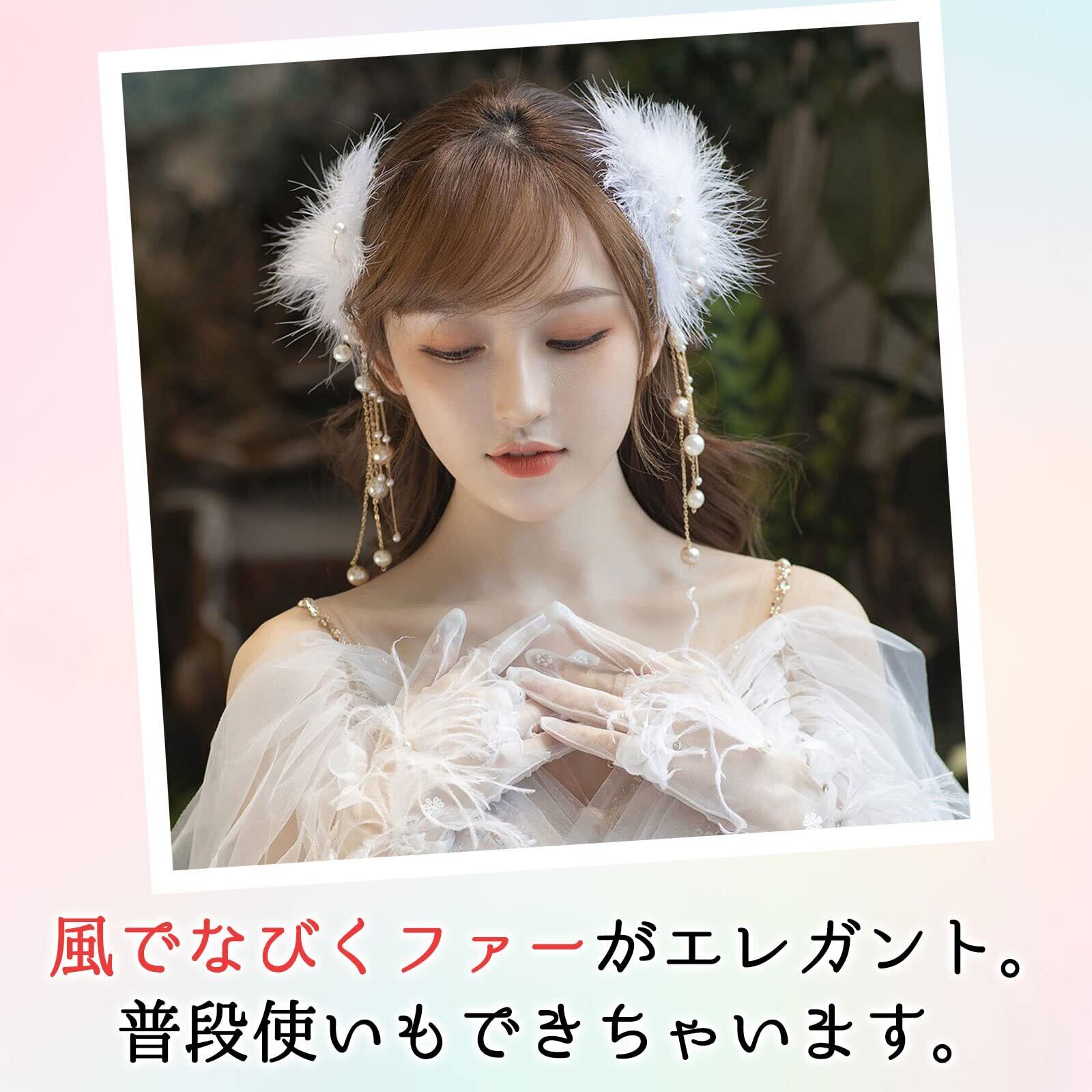 [KAMIRI] ファー付きヘアクリップ 漢服用 髪飾り 羽白色 卒業式 結婚式 チャイナ ドレス