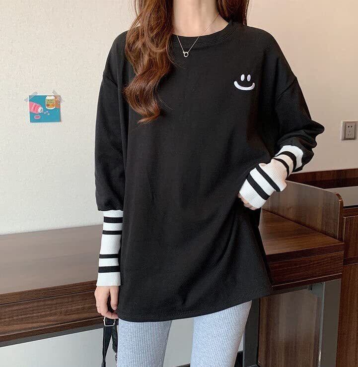 [ジア ジア] tシャツ レディース 長袖 ゆったりビッグシルエットロンT トップス カットソー 笑顔 刺繍 ロングtシャツ可愛い 韓国ファッション
