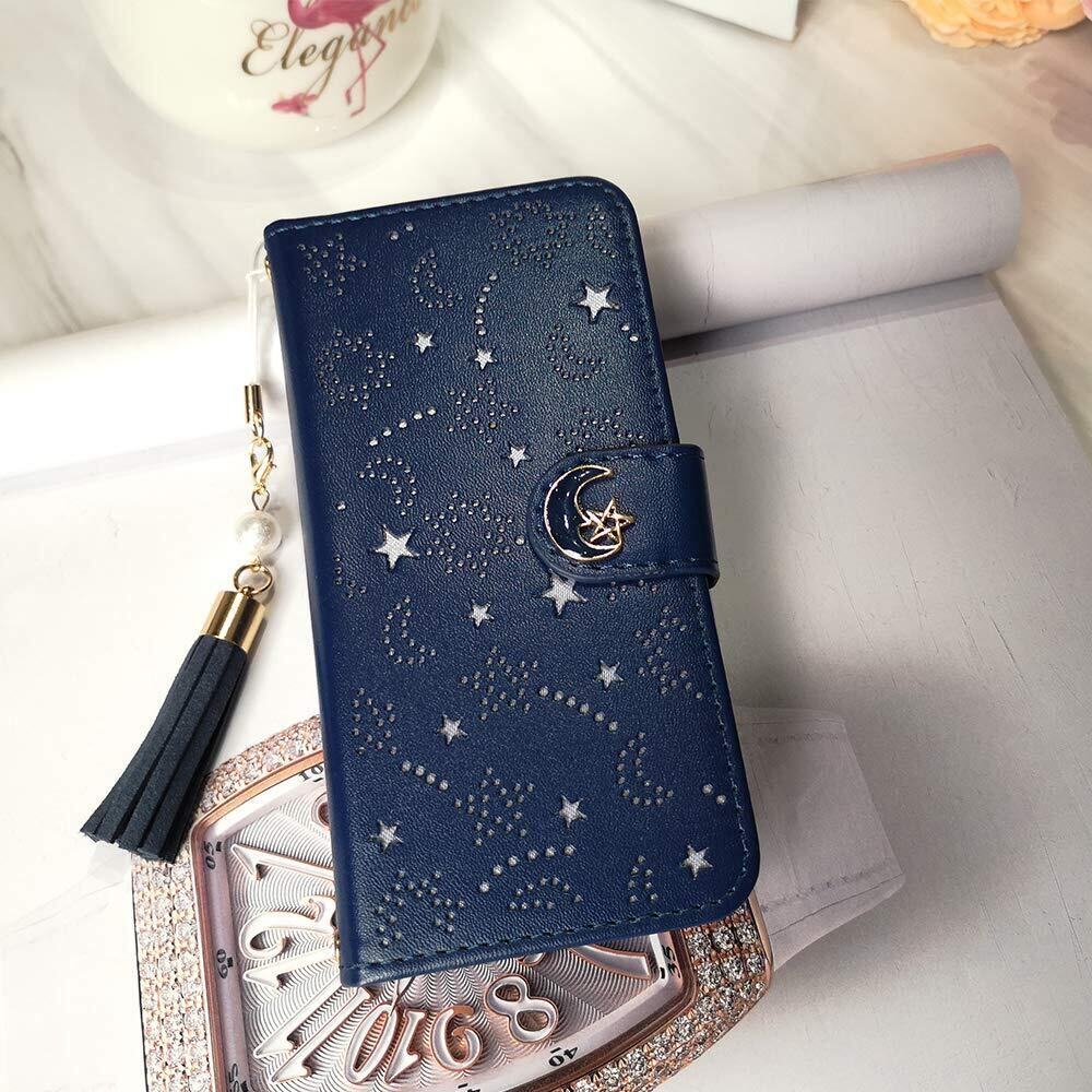 iPhone8 Plusケース手帳型 iPhone7 Plusケース手帳型 iPhone6 Plusケース手帳型 iPhone6S Plus手帳型ケース 携帯カバー あいふぉん手帳型ケース アイホンケース カード収納 ベルトマグネット スタンド機能 アイフォン6S/6/7/8プラス手帳型ケース 耐衝撃 落下防止 全面保護 タッセル真珠 ビジュー 可愛い人気女性 月と星のエンボス レディース専用 きれい おしゃれ 綺麗 上品 (iPhone8plus&7plus&6plus&6splus対応)ネイビー
