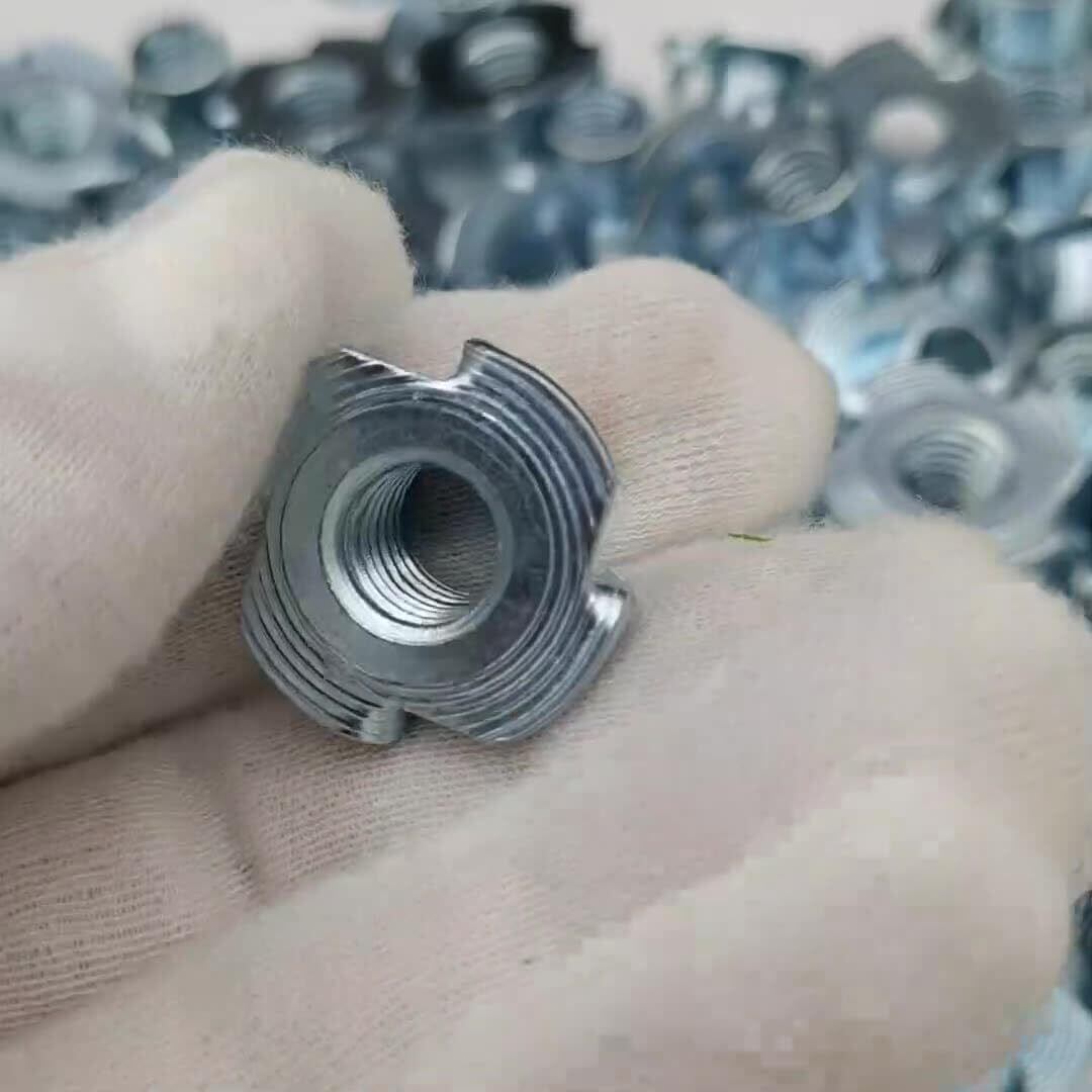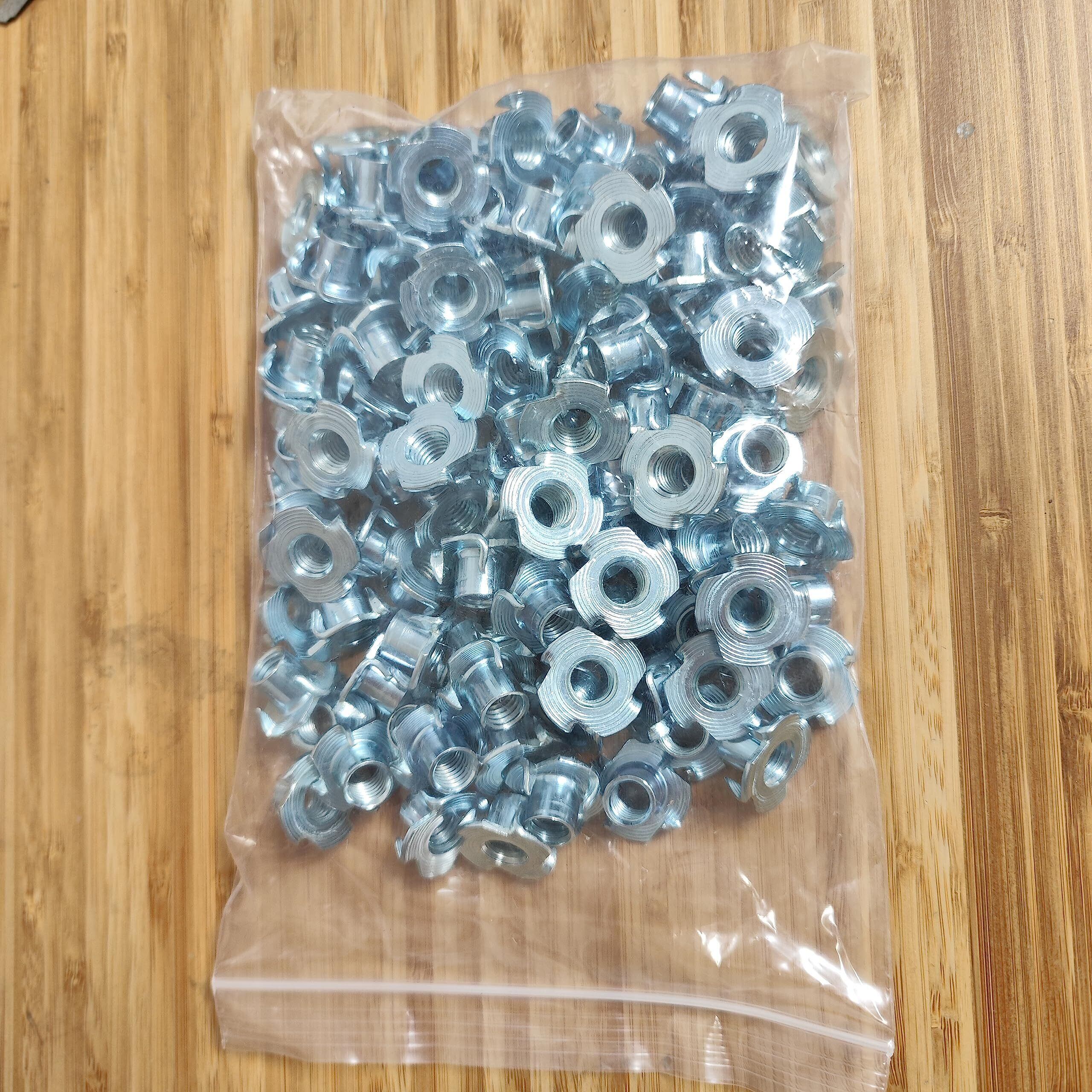 これらのTナットは、木材やチップボード内のねじ式ソケットに強く、信頼性が高く、簡単にフィットするために使用されます。これらの4つのプロングは、Tナットが木片に挿入されて締め付けられたときに回転するのを止めます。