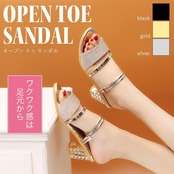 【ワクワク感は足元から】ダブルストラップをアクセントに低めのブロックヒールで仕立てた歩きやすいオープントゥサンダル。ヒールサイドにはメタリックな反射デザインを施しました。煌びやかなイメージを持ちつつも、どんなコーデにも合わせやすいスタンダードなシルエットでヘビロテしやすいお品です。