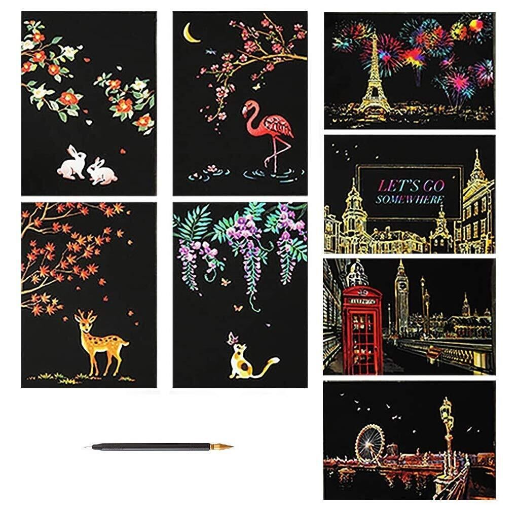 OKUSU-JP 8枚セット スクラッチアート カラフラ ペーパーアート 削るだけで美しいアート 世界的に有名な観光 夜景 花火 面白い 塗り絵 スクラッチ極細ペン1本 大人 子供 世界と風景