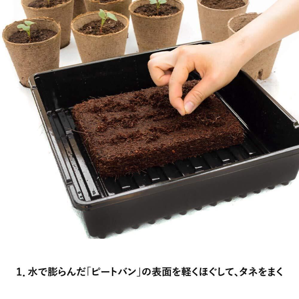 【使用方法】場所も取らないので清潔な室内でも苗づくりができる栽培キットです。育苗トレー(育苗箱)にピートバンを置き、水を注いで膨らませます。種をまいて芽が出たら、霧吹きで湿らせたジフィーポット(育苗ポット)に培養土を入れ、植え替えます。育苗ポットを育苗トレーに並べ、温度が必要な場合はフタをかぶせます。