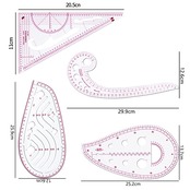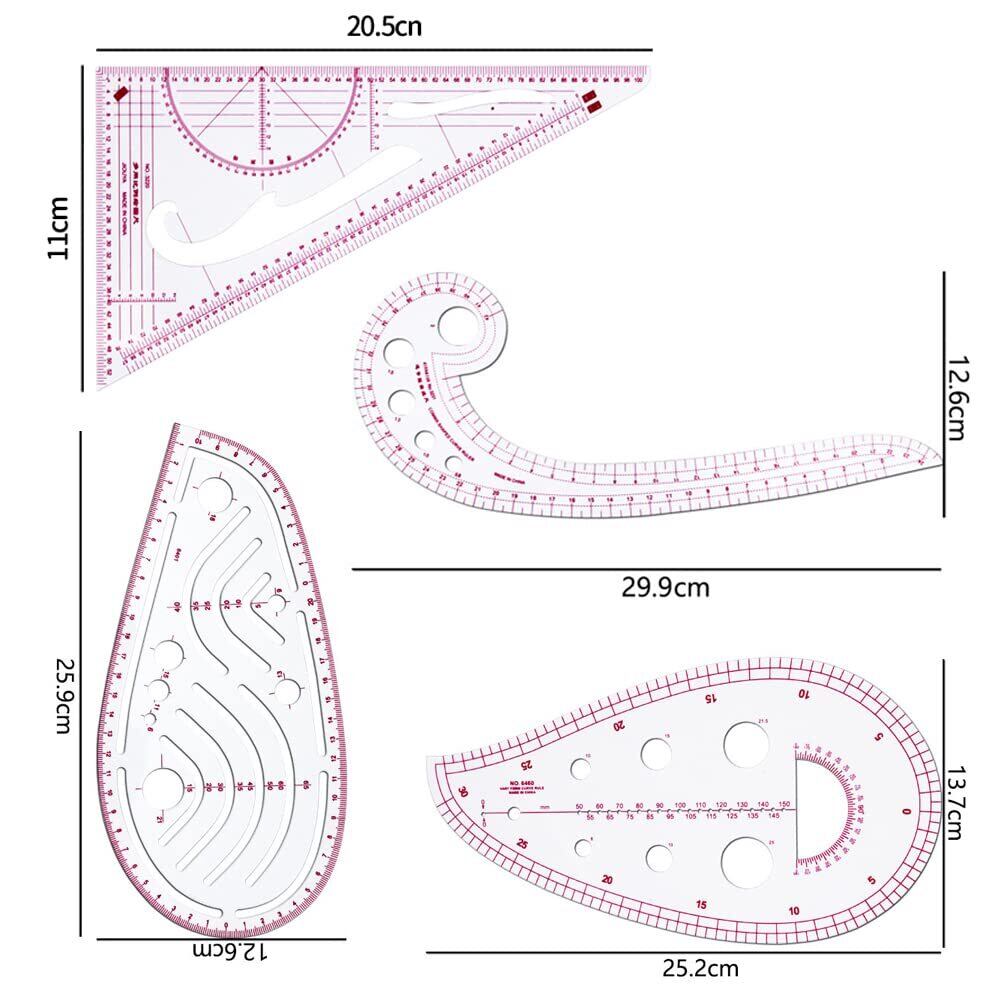 【4枚入り】:セットには、三角定規、カンマ型ルーラー、曲線定規、雲形定規の4種類の縫製定規が含まれております。そして、裁縫用メジャーテープも付属しています。多種類で基本的な描画と仕立てのニーズを満たすことができます。好きな曲線を自由に描かれます。