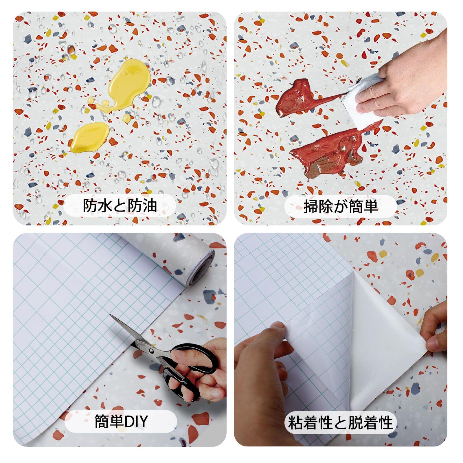 【表面PVC加工で防水効果】ツルツルとした表面の多彩色壁紙シールは防水加工がされているため、キッチンなど水回りのインテリアのリメイクにも使用OK!貼ってはがせるタイプのシールで、模様替えしたいときはすぐに剥がすことができます。柄もキレイめで、まるで本物みたい!また剥がして元の状態に戻すことが可能なリメイクシートなら、賃貸住宅での使用も安心です。※粘着力が少し強くなので、ご注意ください!