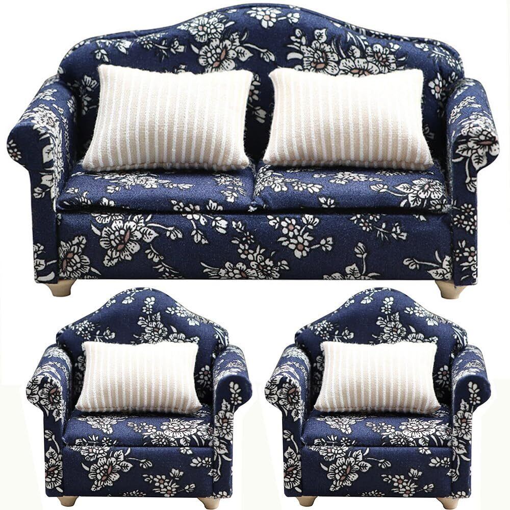 moin moin ミニチュア 家具 1/12 1:12 スケール 家具 ソファ 3点セット B品 訳アリ/ドールハウス 二人掛け 一人掛け シングル クッション ホワイト ブルー 花柄 レトロ バイカラー クッション 布 ファブリック ドール 人形 雑貨 2311mini31 | yankees