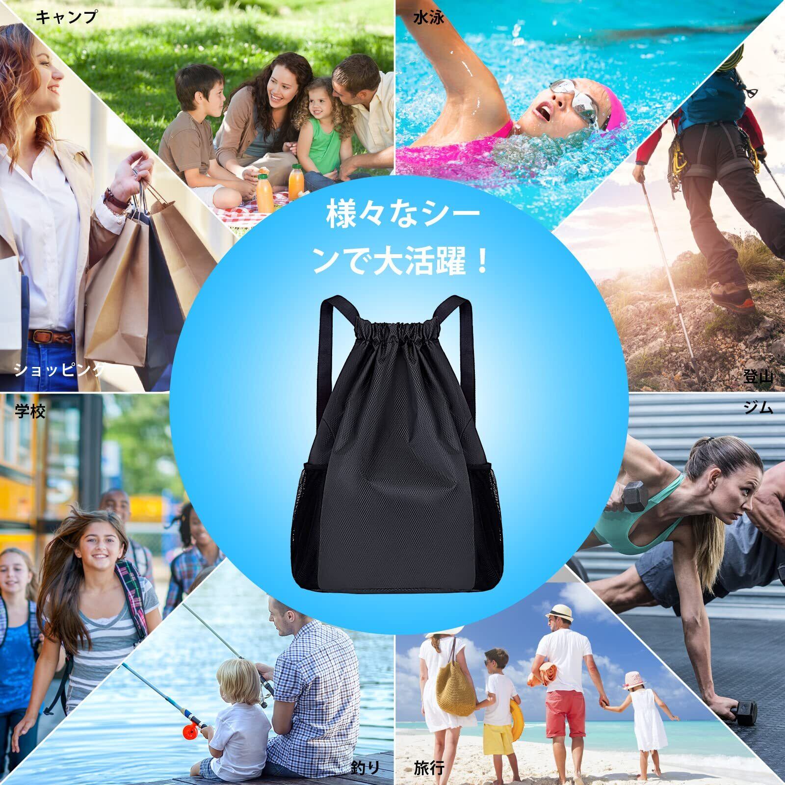 [Ninonly] ナップサック ジムサック ナップザック プールバッグ 大容量 防水 軽量 折り畳み 乾湿分離 多機能 シューズ収納 防水 軽量 水泳 部活 運動 旅行 アウトドア (ブラック)