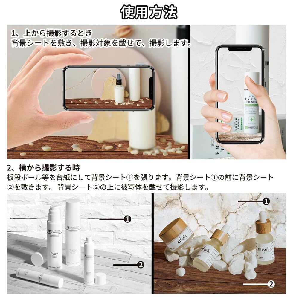 【注意事項】表面にフイルムで覆われて、やや防水できまが、縁部分は防水できませんので、ご使用の時はご注意ください。汚れがあるとき乾いた布で軽く拭いてください。撮影背景シートを耐熱加工を施しておりません。熱食物の撮影にお勧めいたしません。