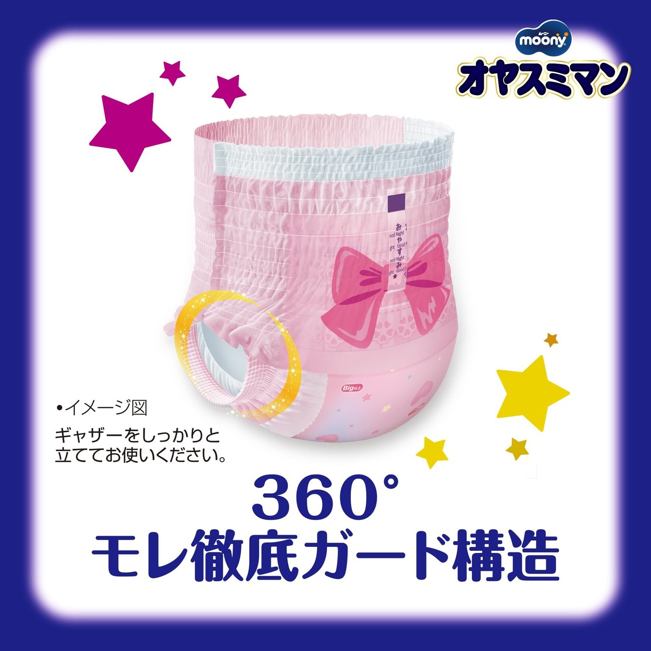 オヤスミマンはおしっこ6回分の吸収力で、朝までモレ0へ! おやすみシール搭載で、寝る前ルーティンが身に付きます。すっぽりハイウエスト搭載でどんな寝相でもお腹をやさしく包み込みます。夜のスペシャルデザインでおむつを嫌がるお子様にも気に入って履いてもらえます。