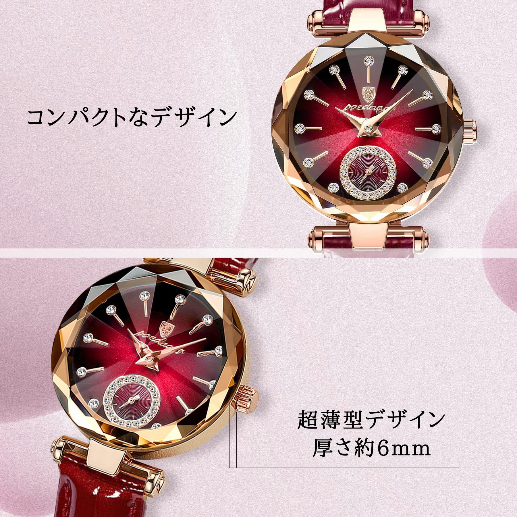 「軽量で小さいサイズ 超薄型時計」:32 mm文字盤幅と6 mm極薄文字盤厚さ、14 mmベルト幅があり、軽くて小さい女性の時計です。女性の手首の大きさによりフィットします。ベルトには着用快適度の高いレザーベルトを採用して、通気性が強くて、装着の快適度が高い。