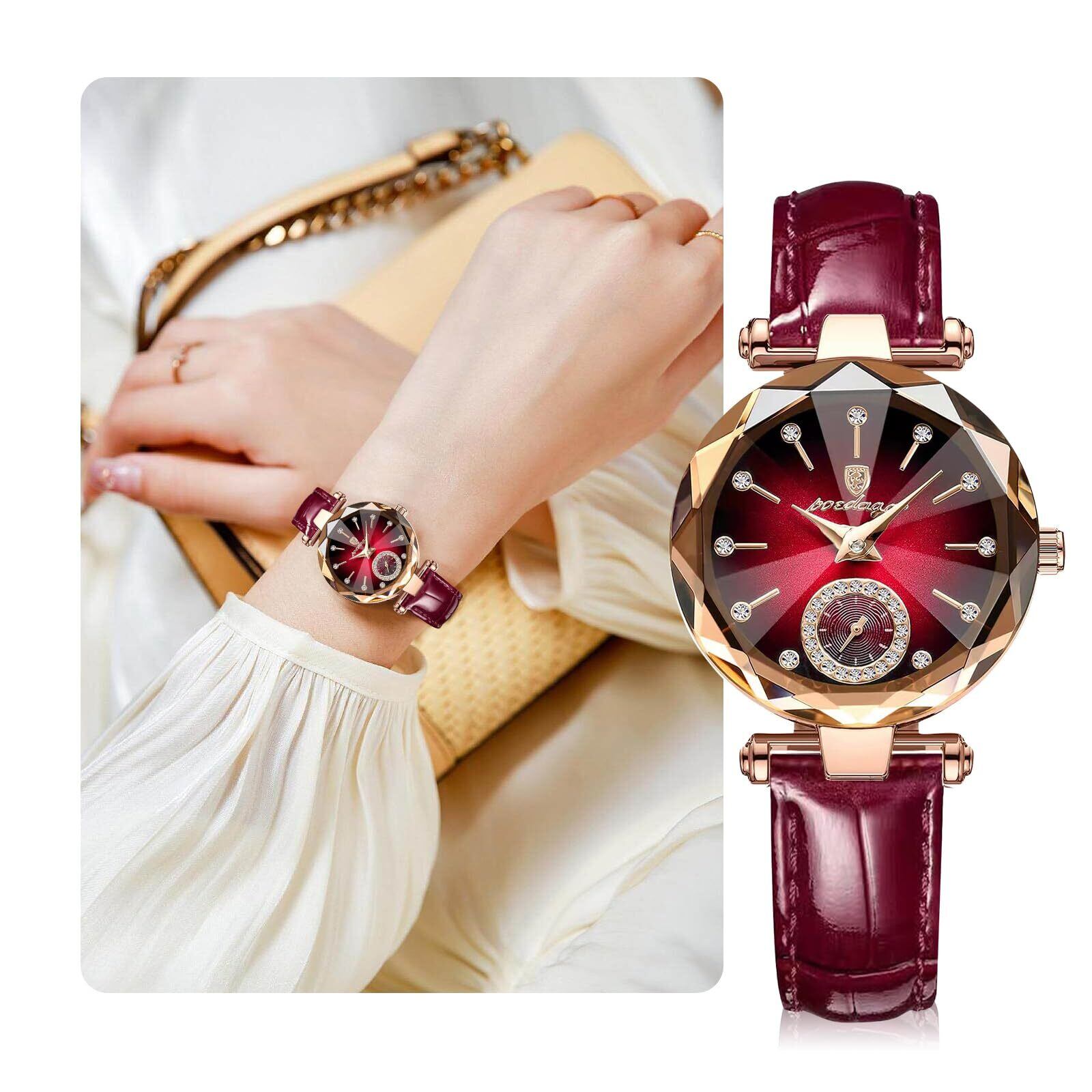「アナログ表示腕時計」:2針表示(時針と分針)+秒数表示、正確な時間が読めます。華やかなカットガラス文字盤と高級なレザーベルト、女性に人気の時計です。かわいいサイズは腕がより細く見えます。
