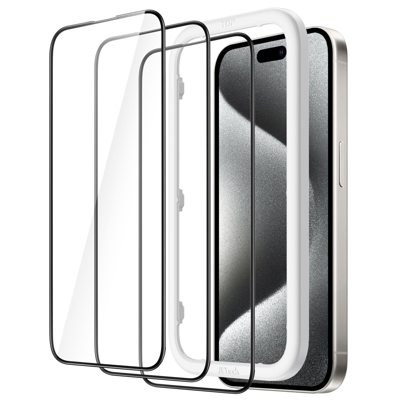 JETech iPhone 15 Pro(6.1インチ用) 全面保護フィルム 強化ガラスフィルム 黒縁 ガイド枠付き ケースに干渉なし HDクリア 3枚セット
