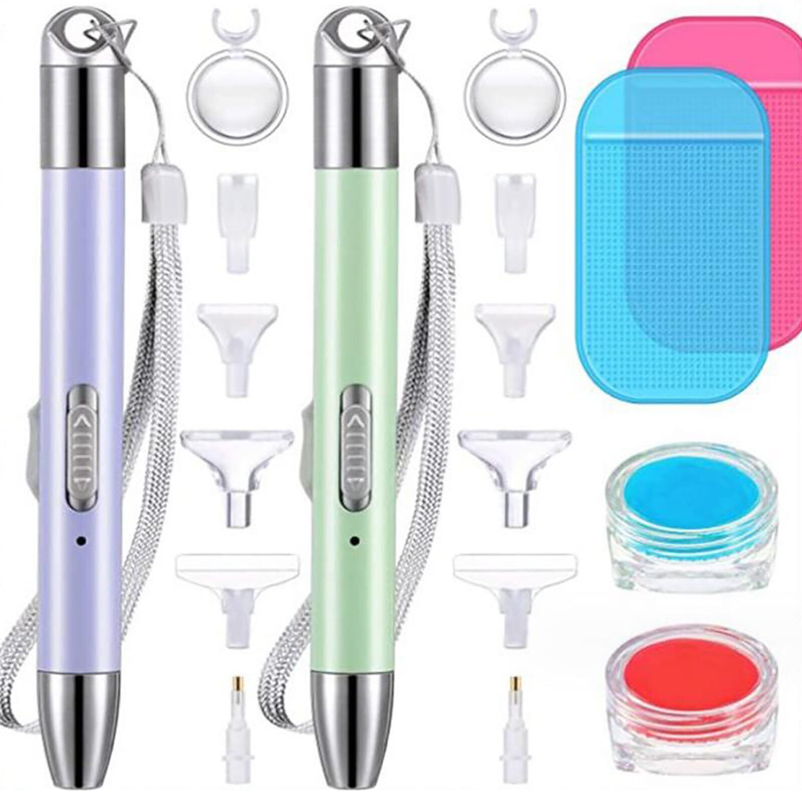 【セット内容】ダイヤモンドブラシ2個、交換用ペン先12個、滑り止めパッド2個、粘土収納ボックス2個、ペインティングワックス6枚。
