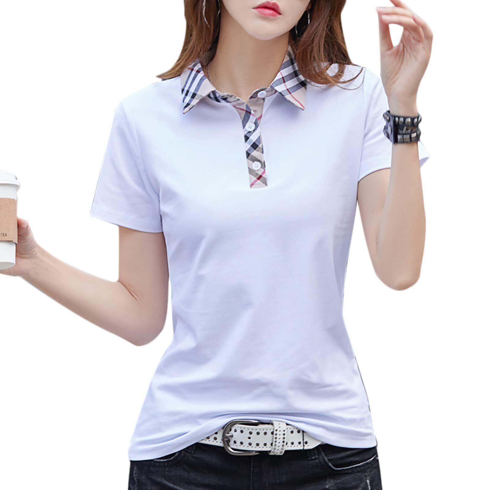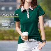 [§ASHE RANGEL] レディース ポロシャツ 衿配色チェック柄 フルオーバートップス Tシャツ 半袖 襟付き おしゃれ 作業着 綿 薄手 着痩せ タイト かわいい 汗じみ防止 女性 ミセス 春夏秋 ゴルフウェア