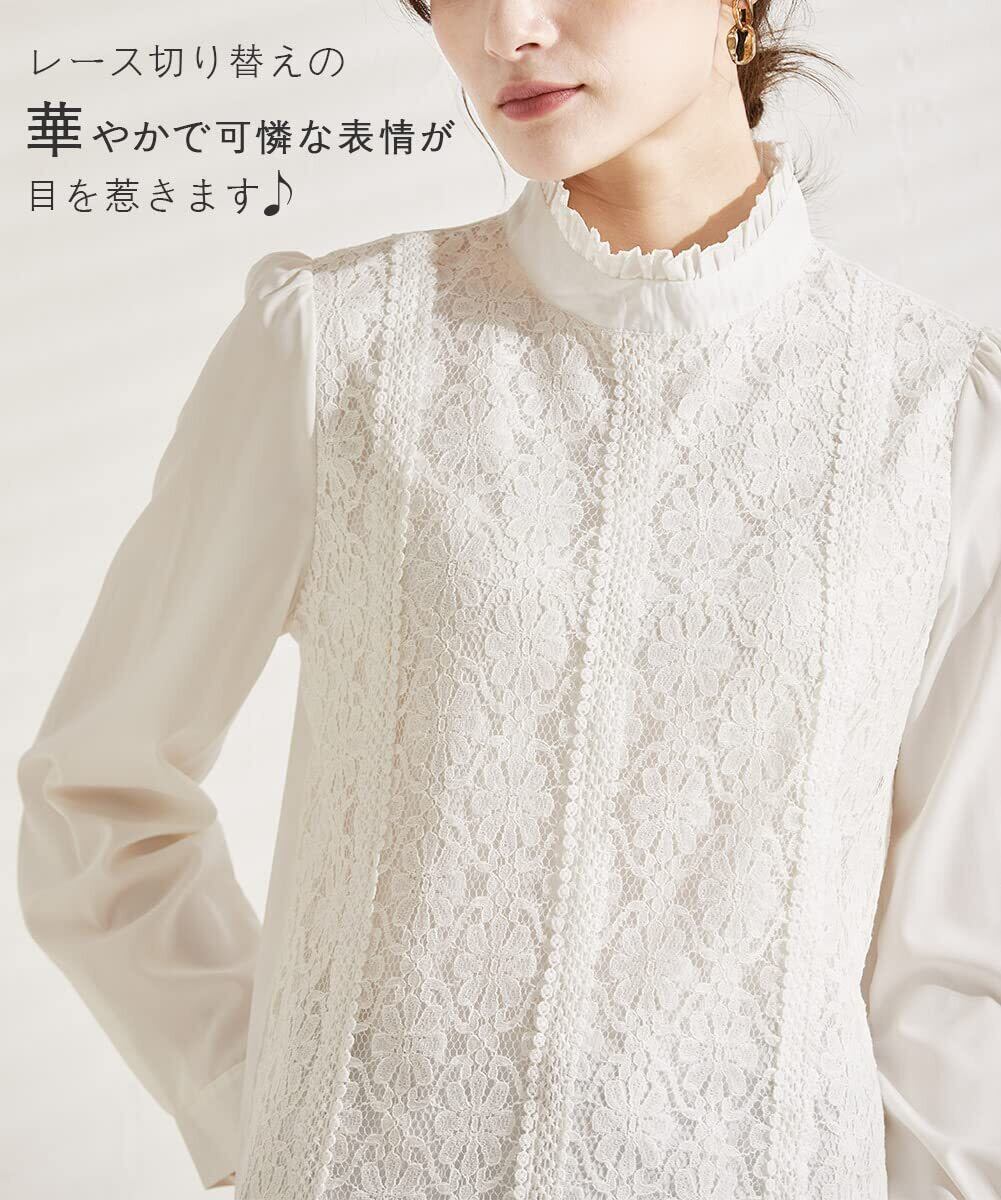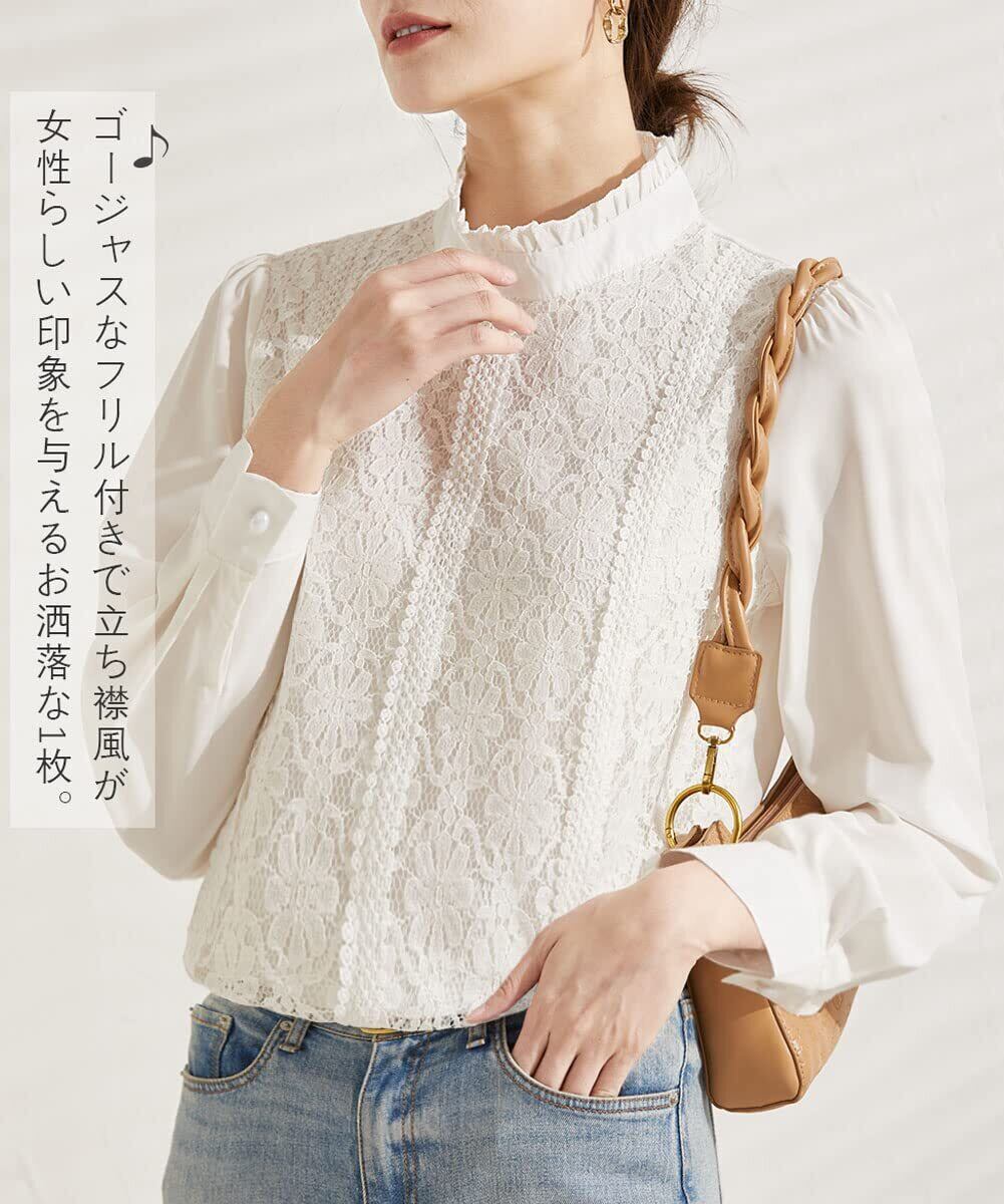 [Yino] (イノ) レース シャツ ブラウス レディース トップス 花柄 フリル 立ち襟 女性らしい 可愛い 着痩せ 長袖 おしゃれ 通勤 オフィス カジュアル デート フォーマル 秋 冬 春