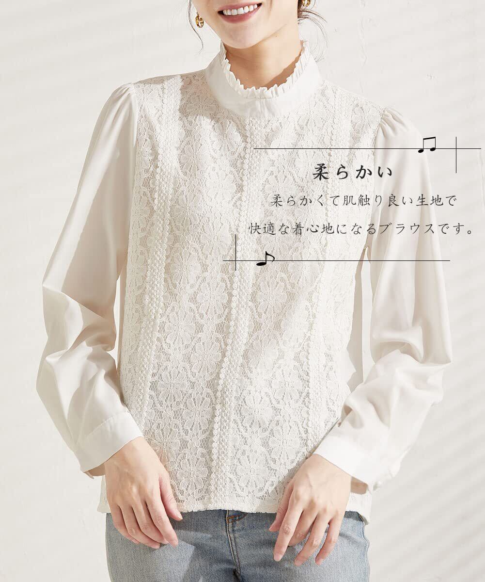 柔らかくて肌触り良い生地で快適な着心地になるブラウスです。首元がフリルのおしゃれなスタンドカラーとなっており、首周りを華奢に魅せてくれる魅力的な一枚です。表は花柄仕様の繊細レースでさりげなく華やかにシャツです!1枚で着用できる程度の厚みがあり、シワになりにくい、常に上品なイメージを保ちます。体に包容性が良くて、体型カバーもばっちり同時に、落ち感ある生地で着痩せ効果が抜群で、どんな服にも合せやすいトップスです。