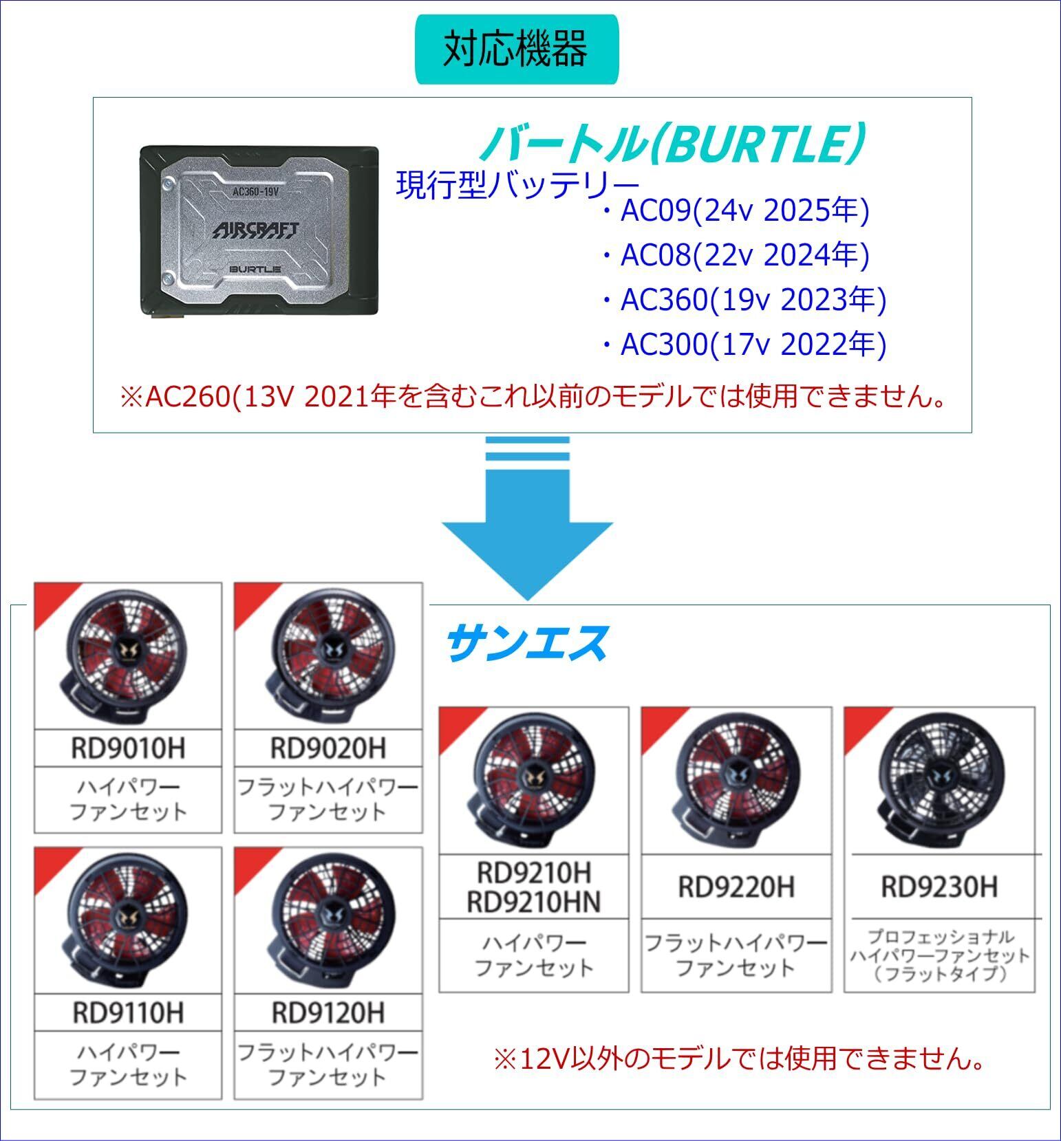 【対象機種】 ・ファン:サンエス 12v RD9010H、RD9020H、RD9110H、RD9120H、RD9210HN、RD9220H、RD9230H ・バッテリー:バートル AC09(24v)、AC08(22v)、AC360(19v)、AC300(17v) サンエス、バートルともにこれ以外の機種でのご使用はできません。