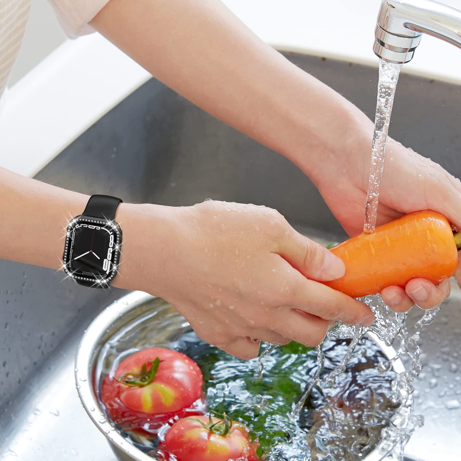 Kawoco アップルウォッチ 保護 カバー 45mm 薄型 防水 強化ガラス Apple Watch 一体型 二重構造 ケース Series 9 8 7 クリスタルダイヤ付き レディース iWatch ケース PC環保素材 (ブラック 45mm)
