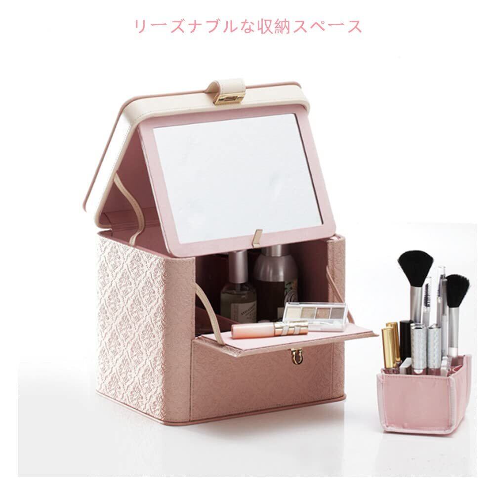 【シンプルで収納力抜群】:化粧水・乳液・下地・ファンデ・ルースパウダー・チーク・ブラシ、口紅、ネイル用品、普段使いの化粧品などコスメをスッキリ収納できます。 【鏡付き】ボックスに鏡がついているので、場所問わずメイクができます。美容師・ヘアメイク・コスプレで活躍!フタを開けることによりトレイが開き、メイク用品の選択や収納もしやすく機能性抜群です。 【整理簡単】ふたを開けて前面扉を開くと、中身が一目瞭然、整理しやすくて、忙しい朝もメイク用品を探す事無く スムーズに使用する事ができます