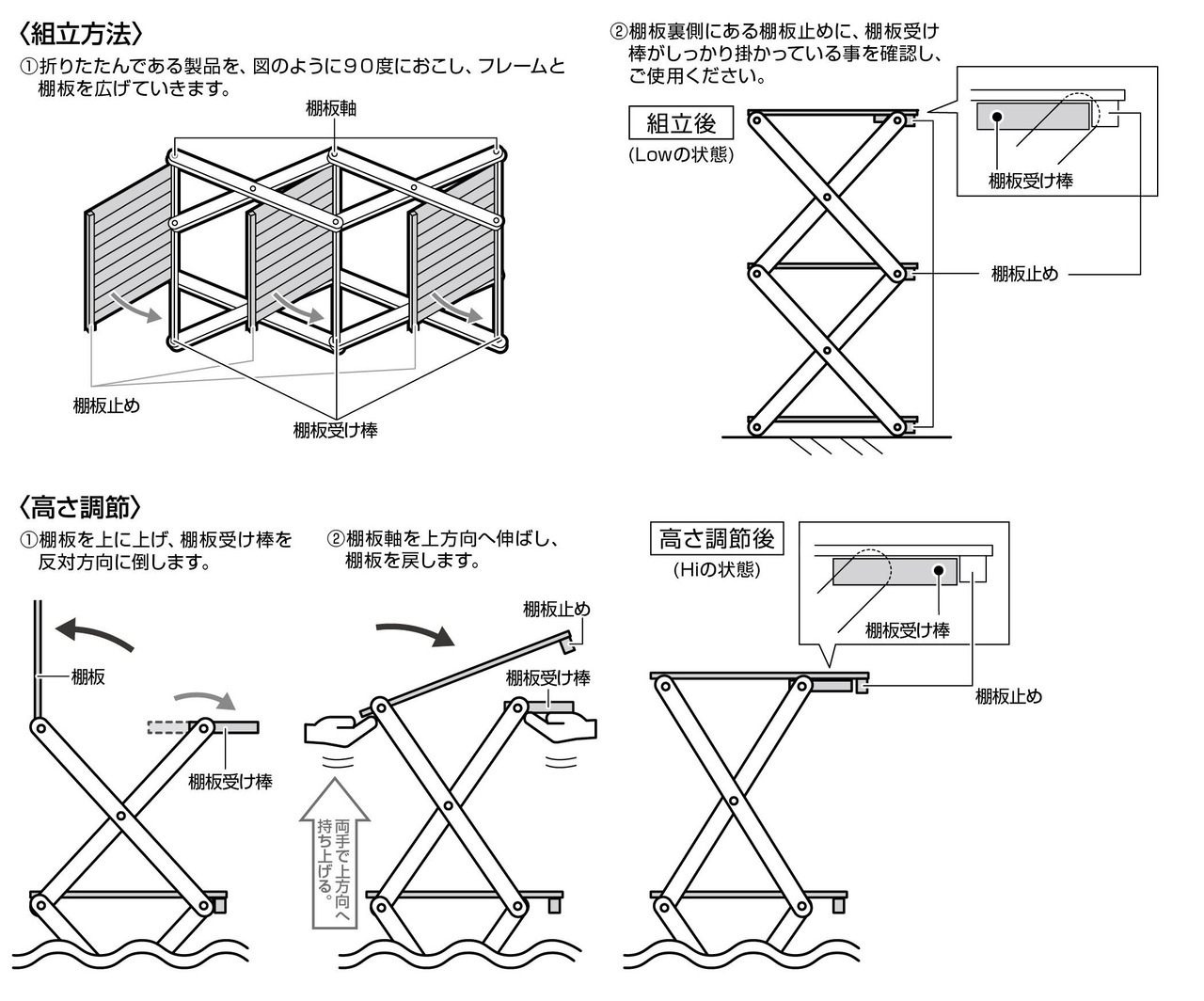 製品サイズ:(約)幅600×奥行300×高さLow570・Hi640mm、収納サイズ(約):幅600×奥行400×厚さ90mm