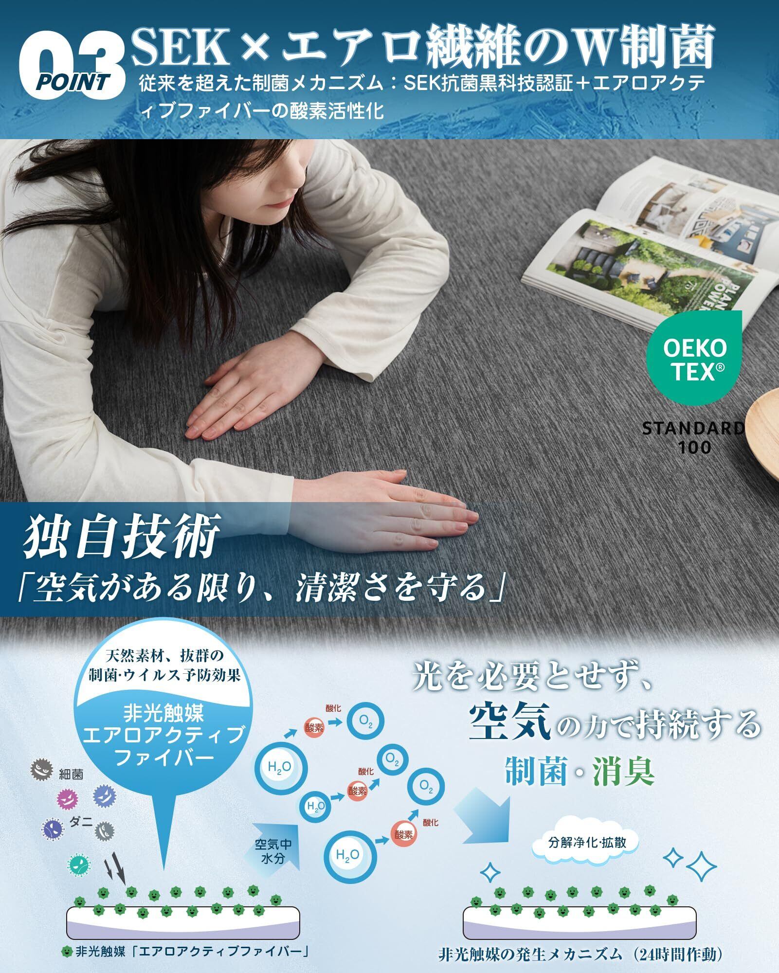 【SEK抗菌防臭×エアロ繊維のW制菌】SEK認証済みの素材に、エアロアクティブファイバーの酸素活性化技術を組み合わせで、空気がある限り、24時間持続的に制菌消臭作用を発揮する。低ホルムアルデヒドなのでお子様にも安心。洗濯しても抗菌防臭・防ダニ効果は持続します。冷房との併用でさらにひんやり!冷房を使用する時間を減らし、省エネも期待できます。