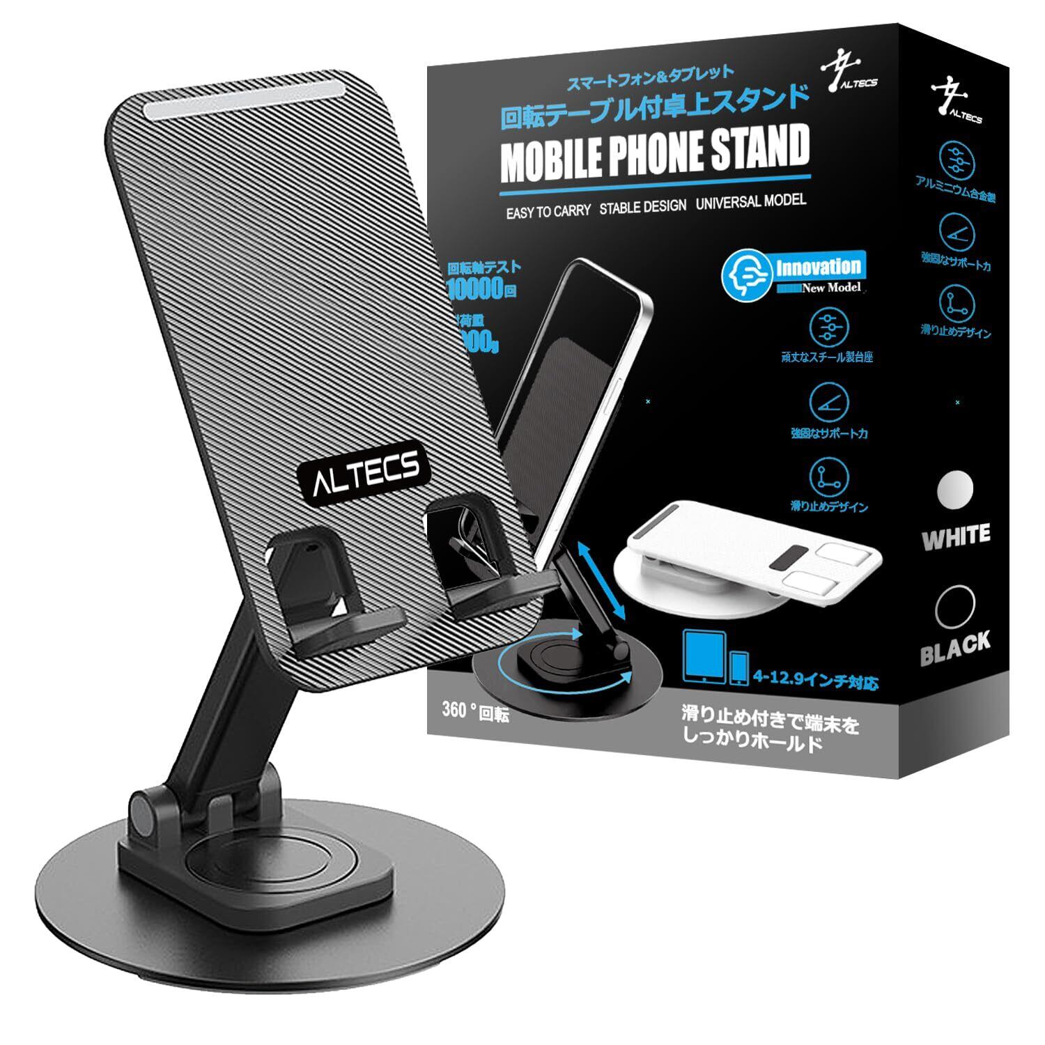 Altecs 回転式 卓上 スマホスタンド タブレット 多機種対応 カーボンスチール製 軽量 折り畳み((黒)