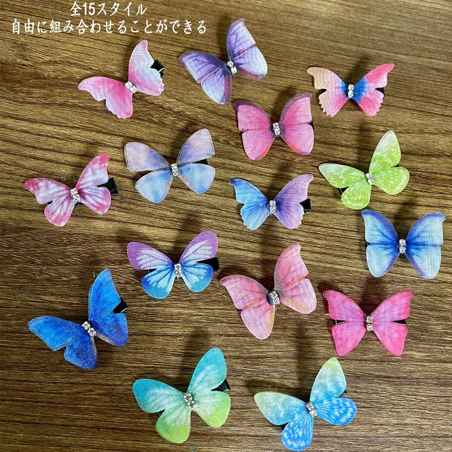 【蝶のヘアアクセサリー】:キラキラ輝く蝶のヘアクリップ全15個。形がかわいらしく、蝶の模様もとてもリアルです。また、カラーバリエーションも豊富で、日常生活のさまざまなスタイルに合わせて自由に色を選ぶことができます。