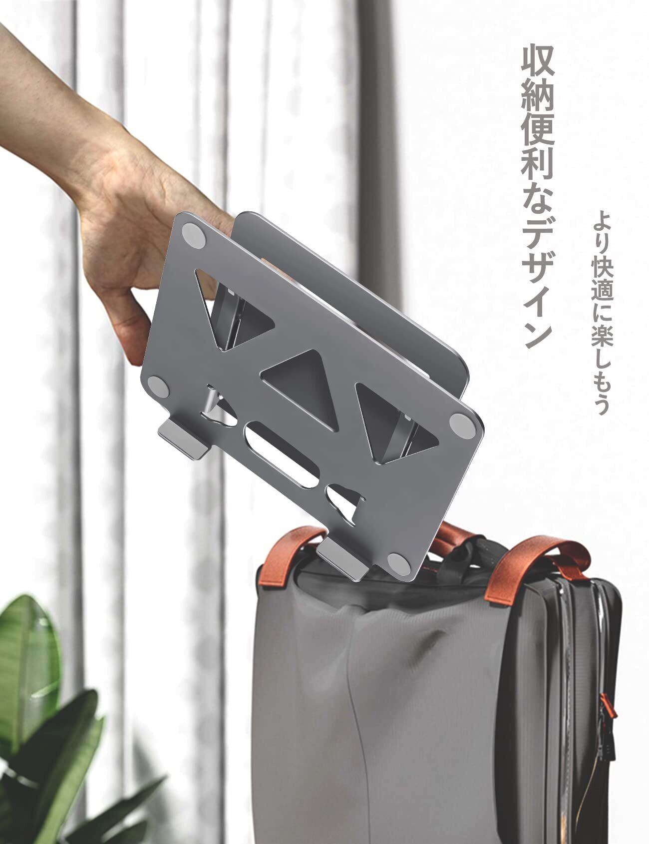 4、【持ち運び&収納便利&省スペース】弊社のノートパソコンスタンドは折り畳み式なので、二箇所の回転軸を折と、外出や出張等々に持ち運んで使用することができます。14インチのカバンにいれても平気です。スタンドの底部にキーボードなどが収納でき、省スペースを有効に活用されます。