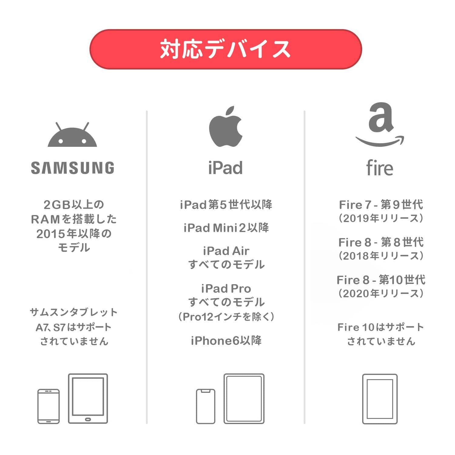 対応デバイス - iOS:iPad 第5世代以降、iPad Pro全モデル(Pro 12.9インチを除く)、iPad Air全モデル、iPad Mini 第2世代以降、iPhone 6以降|サムスン製デバイス:2015年以降、2GB RAM以上 [Samsung Tab A7、A 10.5、S7、S7+はサポート外] | Amazon - Fire 7(第9世代2019年リリースのみ)、Fire 8(第8世代2018年リリース、第10世代2020年リリース); [Fire 10はサポート外] 。