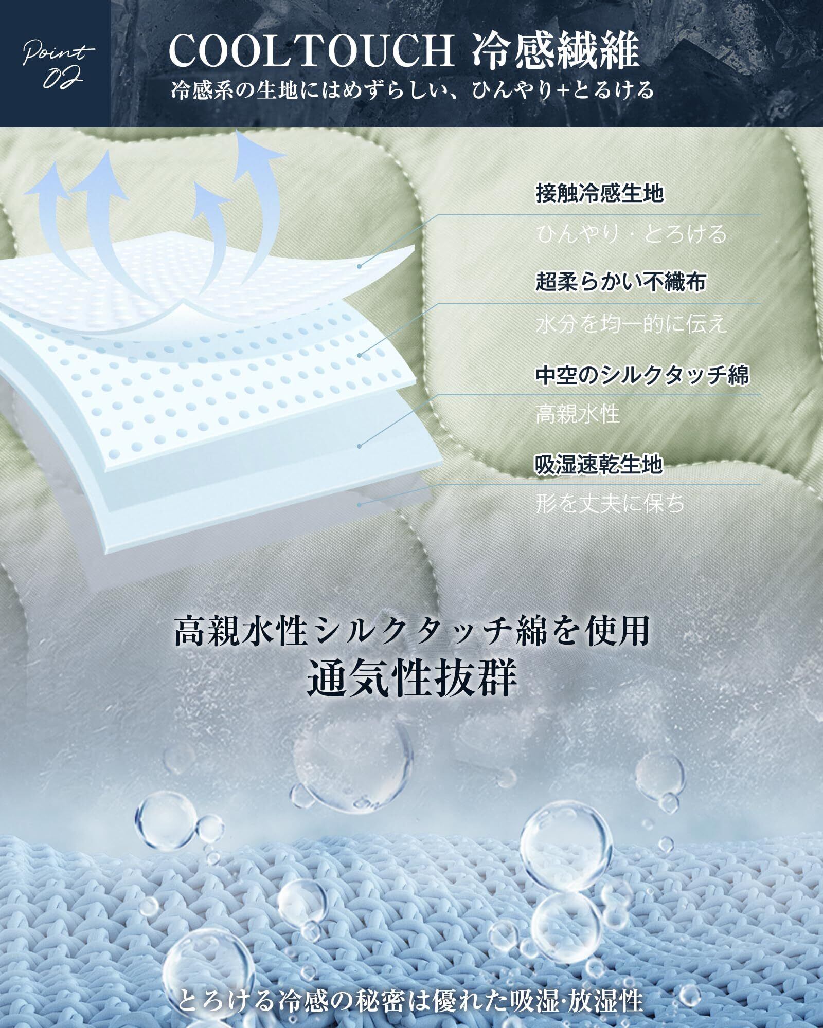 【ひんやり敷きパッド】接触冷感と吸汗機能をもつ冷感新素材を採用します。一般の冷感敷きパッドに比べ、ひんやり感がグレードアップ!ひんやり、サラサラ、快適な寝心地に! ! 冷房との併用でひんやり度がさらにUP! 入浴後や日焼けした後の火照った体を、冷たい敷きパッドでクールダウン! ひんやり冷たくて気持ちいいので、寝苦しい夜も快適な眠り夏の快眠グッズとして、ギフト用にも大変喜ばれています! 接触冷感の冷たさはお部屋の気温にも左右されますので、ひんやり感を高めたいなら、使用前に冷房等でお部屋を冷やしておくことをオススメします。(エアコンの温度設定は26~29℃がおすすめ)。弊店ではエアコンを使いすぎない健やかな眠りを提案するクール寝具は他にも取り扱っています。一緒にセットで使えばさらにクール~暑い夏、蒸し暑い夜、梅雨のじめじめした夜に!