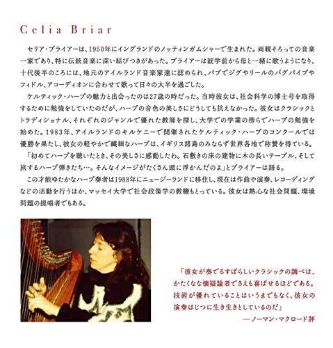 イギリス生まれのフォーク・ハープ奏者、セリア・ブライアーが奏でる至福のしらべ。ケルティック・ハープはもともとアイルランドやイギリスの民謡などを演奏する時の楽器。その素朴で柔らかな音色は日本人にとって馴染みやすく、何とも言えない郷愁と安堵感に浸ることができます。そんな伝統の香り漂う抒情的なハープのメロディに優しく絡むのは、チェロやアイリッシュ・フルートなどのシンプルな楽器の数々。心が疲れた時、忙しすぎる日常にふと寂しさが募った時・・・、まずは頭を空っぽにして、遠き記憶に想いを馳せ、この「やすらぎの音楽」に慰めと癒しを求めてみませんか。次の瞬間には、暖かなやすらぎに包まれることでしょう。