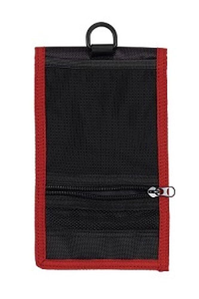 表面のフラップに無限のファイティングスピリッツの象徴である「コマンダーアイ」と無限ロゴをプリントした、ブラック×レッドのスポーティなクレデンシャルケース