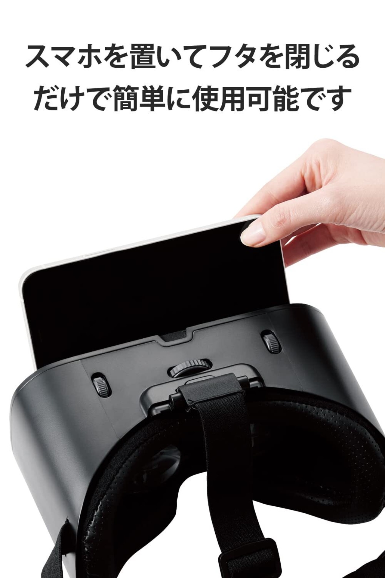 ●お手持ちのスマートフォンにVR対応アプリをインストールし、本体にセットするだけで、上下左右360度全方向の臨場感あふれる映像が楽しめます。●VRコンテンツ再生中に周囲を見渡すと、頭の動きに合わせて視界が360度動き、まるで自分がコンテンツの中にいるかのような仮想体験が楽しめます。●左右の目の幅に合わせて見やすい位置に調節ができる超ワイド目幅調節機能を搭載しています。●また、細かく焦点距離の調節ができるピント調節機能も搭載しています。●広い開口部設計により、眼鏡を装着した状態でも使用可能です。●※幅約142mm以内。●眼鏡の大きさ・形状によっては使用できない場合があります。●スマートフォンは差し込むだけで簡単に装着できます。●柔らかく通気性に優れたパンチングソフトレザー仕様のフェイスパッドを採用しています。●4.7~7.0インチの幅広いサイズのスマートフォンに対応しています。●歪みが少なく視野角が広い、VR専用設計の非球面光学レンズを採用しています。●※対象年齢は15才以上です。●エレコム社環境認定基準を1つ以上満たし、『THINK ECOLOGY』マークを表示した製品です。●環境保全に取り組み、製品の包装容器が紙・ダンボール・ポリ袋のみで構成されている製品です。