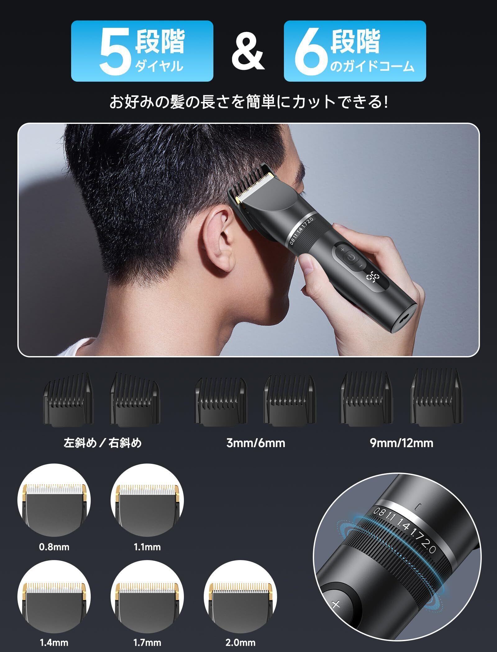 バリカン 2025新登場 USB充電式 ヘアーカッター 電動バリカン バリカンメンズ 5段階刈り高さ調節 3段階スピード LEDディスプレイ 大容量バッテリー 自動研磨 6種類ガイドコーム 低騒音 IPX7防水 コードレス バリカン子供 家庭用 散髪用 業務用 セルフカット 坊主 ツーブロック 軽量