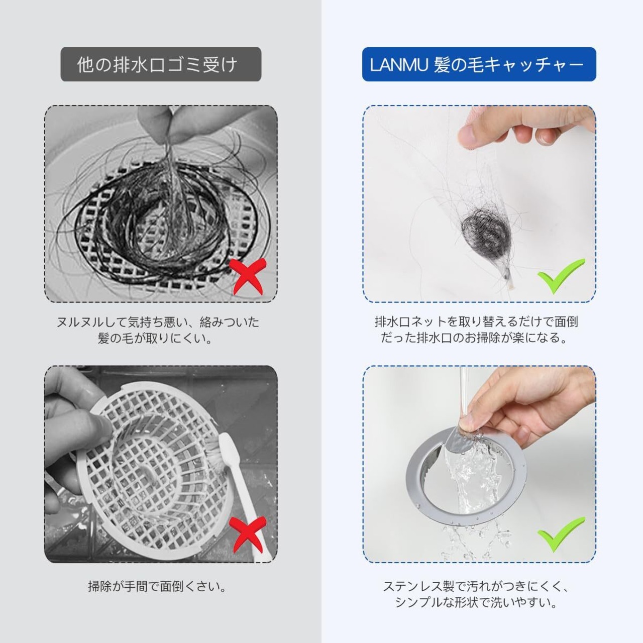 LANMU 髪の毛キャッチャー お風呂 排水口ネットホルダー 100枚 水切りネット付き お風呂 排水溝 ゴミ受け 排水溝 ゴミ受け ステンレス製 髪の毛 細かなゴミ キャッチ 直径8~10cm排水口対応 特許出願 (本体+水切りネット)