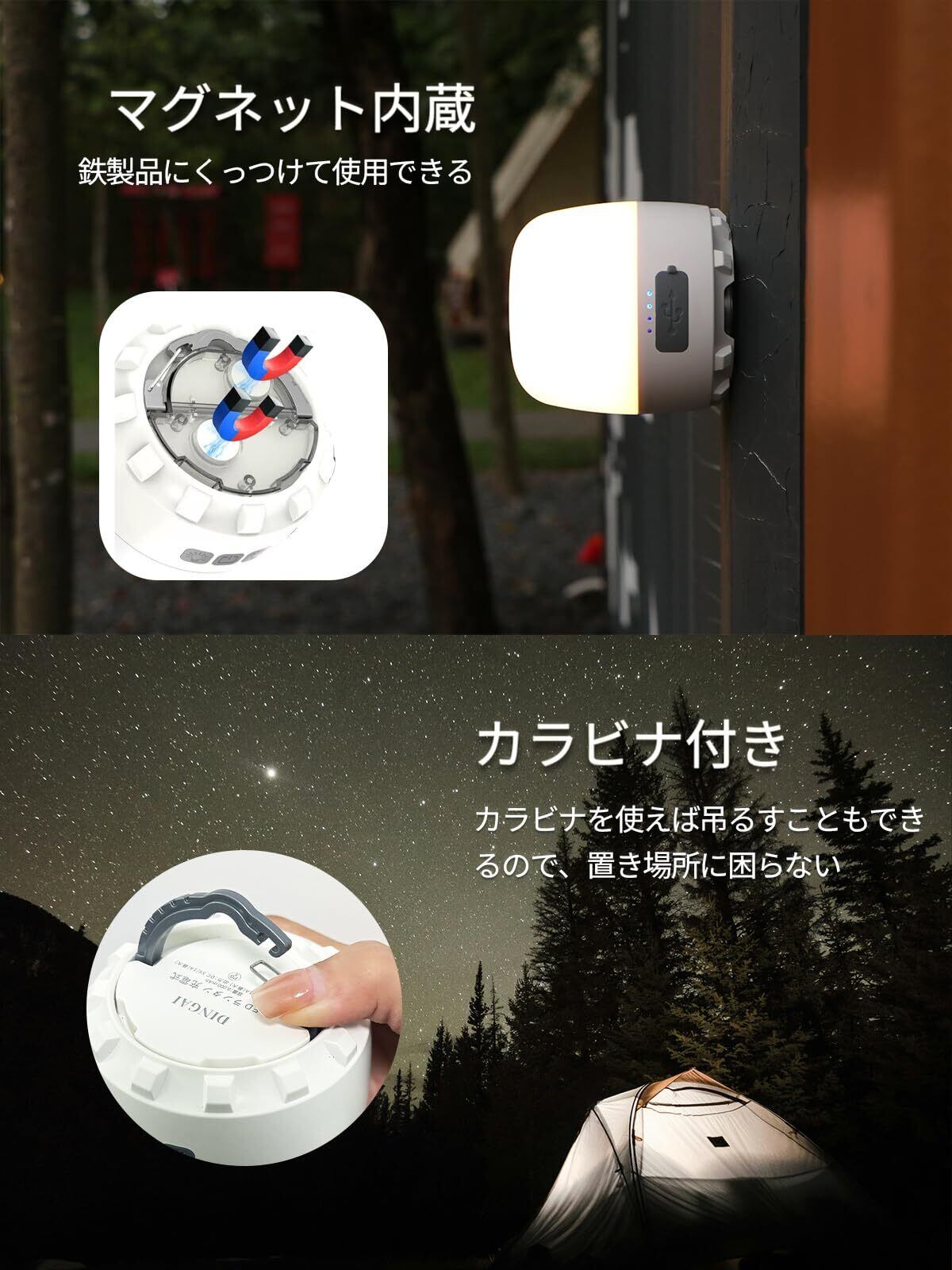 【マグネット付き・置き場所に困らない】ledランタン 充電式は上部のカラビナを使えばタープ下やテント内、バックパック後ろなどでも吊り下げられます。上部にマグネット内蔵したため、車中泊はもちろん、テントの横に車を配置したりカーサイドテントを利用したりする時にとても便利です。またボンネットや冷蔵庫などにくっつけておくと、いざと言う時にすぐに使えます。