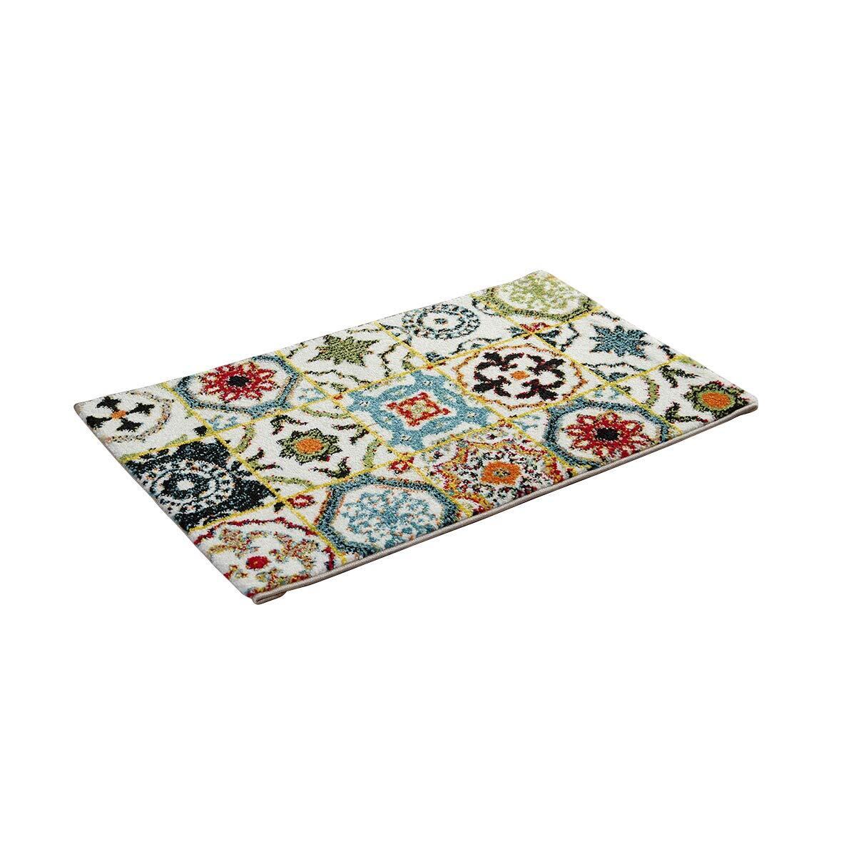 ウィルトン織りの玄関マットです。ラグでも人気の柄です。ウィルトン織りは非常に耐久性の高い織物です。家の中でも靴を履いて生活するヨーロッパで、土足で扱うことを前提として作られておりますので、長時間踏みつけてもヘタリにくく、弾力性もあり長くご使用頂けます。本商品の『繊維の密度を表すノット数』は112,000ノットです。本商品のパイル部分にはポリプロピレン素材を使用しております。ポリプロピレンはヘタリにくく、耐久性に優れ、繊維の中でも軽い素材です。また、汚れが付着しにくく、遊び毛や毛玉が非常に出にくいという特徴もあります。ホワイトをベースにカラフルな色で柄を出しています。玄関のワンポイントとして、ご使用していただきますと華やかになり高級感がでます。抗菌・防臭、消臭機能がついていますので、臭いが気になる玄関でも安心してお使いいただけると思います。