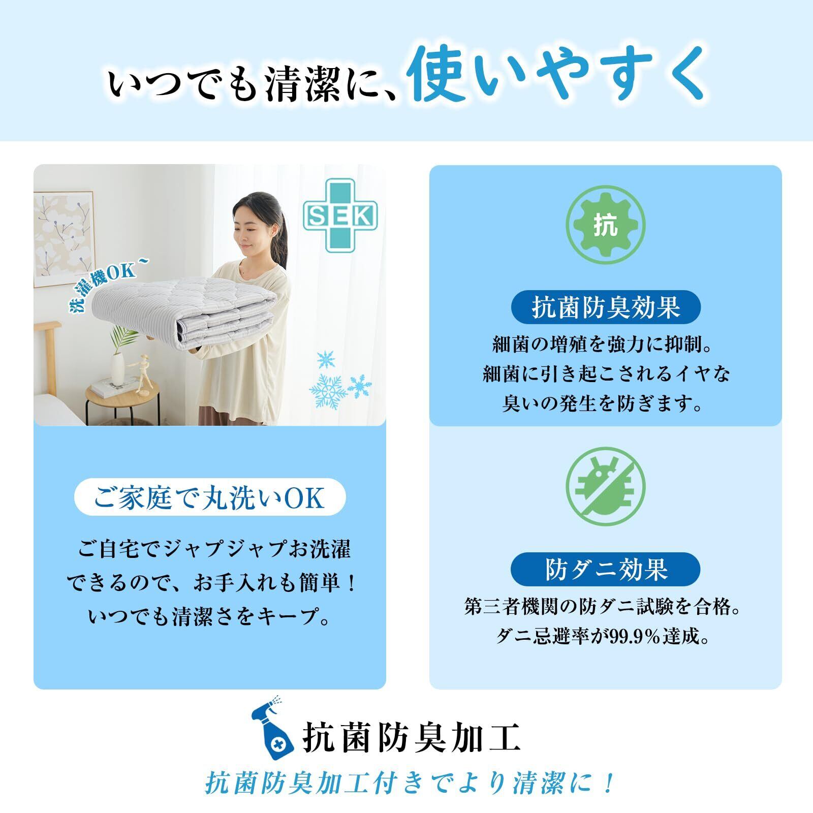 【着脱簡単&洗濯機で丸洗いOK】取り外しが簡単な四隅ゴム付でズレにくく取付も簡単にできます。洗濯機で丸洗いできて、清潔に保てる敷きパッドです。汗をかいたり活れやにおいが気になったりした場合でも丸洗いできるのでお手入れ簡単です。中材には、ポリエステルわたを使用しており、乾きも早く夏場に大変重宝します。