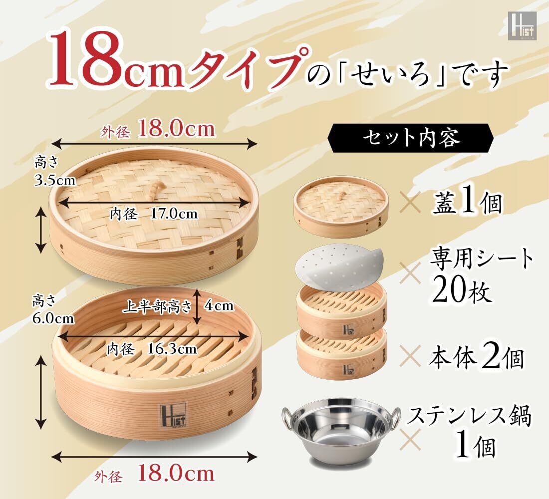 ハイスト Hist ih対応 【鍋つき】 蒸篭(セイロ) 2段(本体2個蓋1個)セット 業務用 せいろ 蒸し器 竹セイロ 杉セイロ 蒸籠 (鍋付き・杉セイロ18cm)