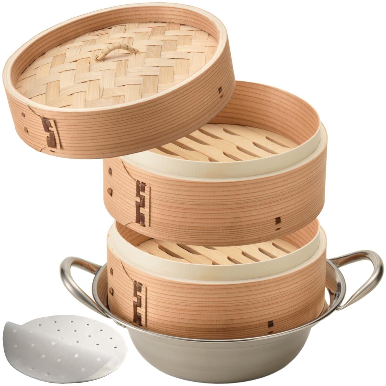【様々な蒸し料理に最適】肉まんやシュウマイなどの中華料理や蒸し野菜などの様々な料理に使える杉セイロの蓋1個と本体2個 セイロ専用鍋のセットです。